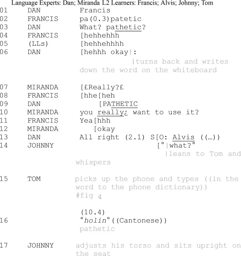 Dan (LE) assigns the turn to Francis (LL) by summoning his name (line 01). Francis renders the word “patetic” (line 02). He initially pronounces the first syllable “pa” and stops for a 0.3-s before he self-repairs the word to “patetic,” revealing his slight unsureness and difficulty in pronouncing (line 02). Dan prompts ratification and subsequently recasts the problematic word as “pathetic” in the same turn (line 03). Given it is somewhat unexpected to hear people depicting himself as pathetic, both LEs (Dan and Miranda) initiate repair attempts (respectively in line 03, line 07, and line 10) to offer Francis interactional floors to either ratify or reject the proposal of “pathetic.” After three attempts to confirm with Francis (line 04, 08 and 11), both LEs acknowledge the word: Dan formally writes down the word on the whiteboard (06); Miranda registers with “okay” (12).