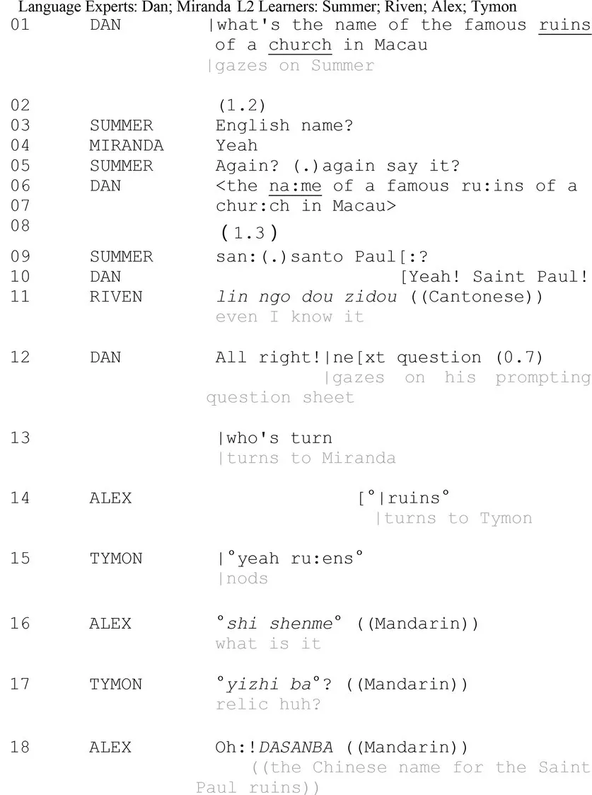 In line 01, Dan issues the question and selects Summer as the recipient. Given the analytic focus of the study is on peer interactions, detailed analysis of LE–LL interactions from line 01 to 13 is excluded. Starting from line 14, Alex selects his peer (Tymon), initiating a private interactional trajectory. The onset of the private talk overlaps with but does not interrupt the public interactional task. Alex retrospectively targets the word “ruins” embedded in the proceeding repair sequence and resorts to a third party (Tymon) to negotiate for the meaning. The repetition of “ruins” (line 14) fails to specific his designs to Tymon, who reiterates “ruins” as his receipt (line 15; Greer et al., 2009). Sequentially, Alex builds on Tymon’s turn and explicates his question by asking what it is (line 16). Tymon renders an L1 referent with an uncertain question maker “ba” (line 17). The subsequent occurrence of elongated “Oh:” (line 18) as a change-of-state token (Heritage, 2010) registers Alex’s information receipt, indicating that Alex’s epistemic stance has been updated: alter from “not-knowing to knowing” (Sidnell, 2009, p. 105).
