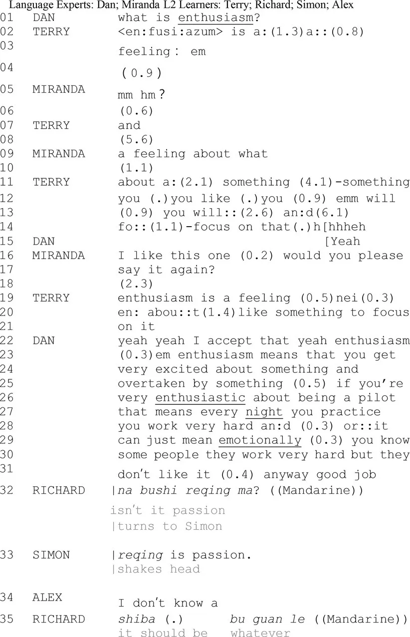 Dan initiates a public talk about “enthusiasm” in the beginning line with Terry. While Terry attempts to explain “enthusiasm” (line 02–04, line 07, line 11–14, and line 19–21), Dan and Miranda scaffold Terry’s utterance. Now and then from line 05–17. From lines 22–31, Dan clarifies the meaning of “enthusiasm” to scaffold learners’ interpretation. It is quite salient here; Dan closes the talk around “enthusiasm” by “anyway good job” (line 31). In the most immediate next turn, Ricard (LL) initiates a disjunctive question to his peer (line 32). Given that both “enthusiasm” and “passion” are frequently translated to “reqing” in Chinese, the initiation endorses Richard’s orientation to a rather vague understanding of “enthusiasm” and his attempt of providing a candidate understanding of enthusiasm as passion. In contrast to the wh-question, disjunctive questions convey an assumption to a larger extent by offering a candidate understanding (Svennevig, 2008). In another sense, Richard seeks to confirm his understanding of “enthusiasm as “reqing” from his peer. However, the proposal of referring “enthusiasm” to “passion” is sequentially rejected by the selected peer Simon (line 33). Shaking his head and linking what Richard has uttered (line 32) to a synonym “passion,” Simon rejects Richard’s proposal of equalizing enthusiasm as “reqing” or “passion.” The disaligning discussions of enthusiasm, further, draw another learner (Alex) into the private interaction. Alex self-reports his stance toward the negotiating sequences by clearly uttering an “I do not know” (line 34). There may be different interpretations of Alex’s account. One may agree that either he confuses about the meaning of the focal word, or he intends not to be involved in possible further discussion about the word. In either case, Alex’s reaction fails to support the progressivity of the private interactional task. Richard, then, self-closes the private interaction he initiated with a “forget it” and a “buguanle (whatever)” (line 35) which indicates that the peer interaction around “enthusiasm” is abandoned. Notably, before he concludes their negotiation, Richard repeats his stance, which still sticks to his original understanding of the word. The “shi ba (it should be)” in line 35 conveys that Richard adheres to his initial understanding of the focal word. His peers, both Simon and Alex, however, fail to advance each other’s understanding in the private negotiation-for-meaning sequence. In this episode, participants’ knowledge and understanding are not saliently updated to a K+ stance. Albeit peer interaction offers temporal learning opportunities, it yields only invalidate learning outcomes. This peer interaction is then classified as inefficient in terms of learning outcomes. Nevertheless, it still presents how a temporal learning opportunity is managed in private peer interactions.
