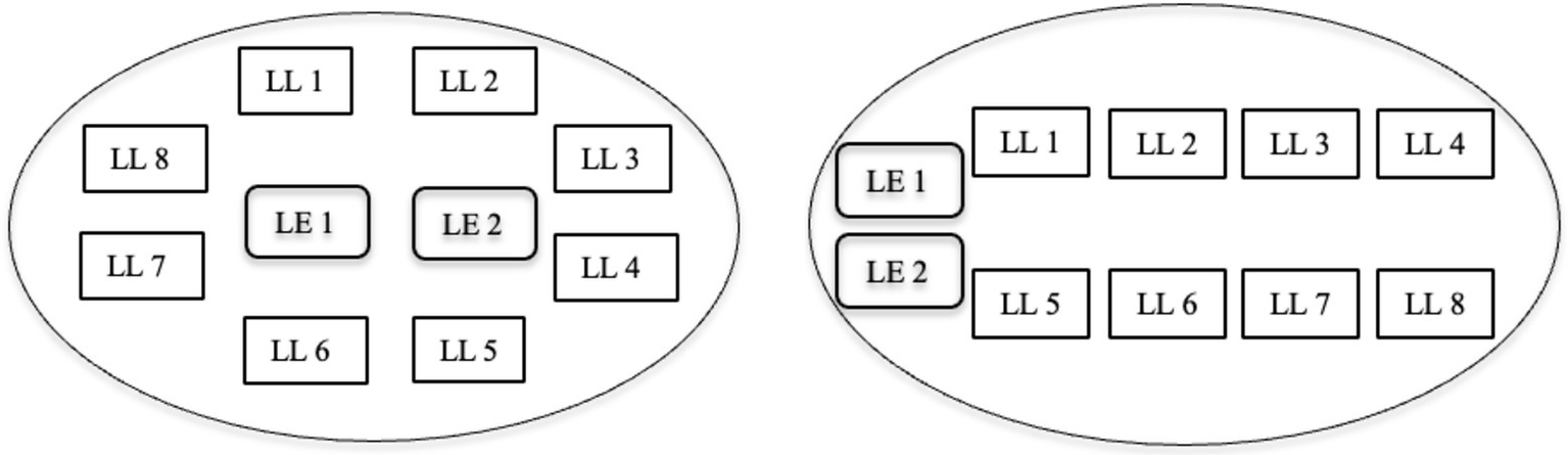 The research took place in three CfL classrooms at a university in Macau. To meet the language requirement needed for English-medium education, the university arranged a weekly interactive English course to amplify learners’ exposure to and the application of English. In each of the chosen classes, there were two language experts (LEs) and eight language learners (LLs). To create a communication-friendly classroom, students frequently sat in a circle or in two lines (Figure 1). Activities were not rigorously arranged and pre-planned so that more interactional opportunities and space can be offered to students. The underline tenet was learning opportunities will naturally emerge from both classroom activities and interactions.