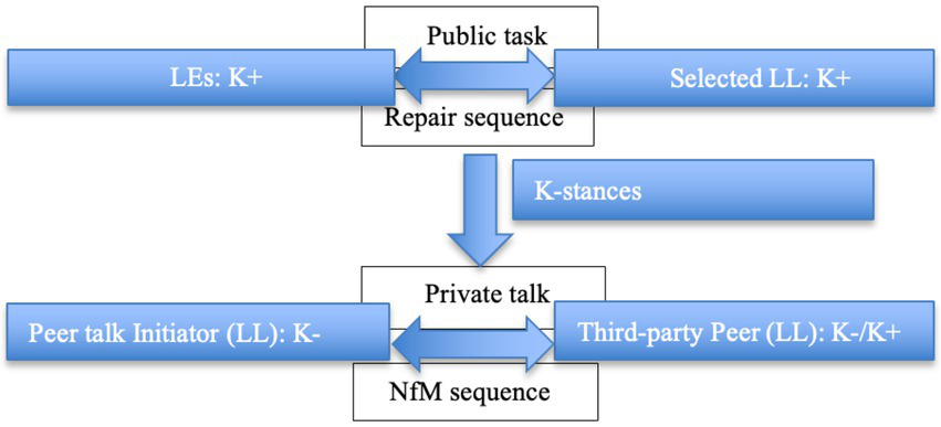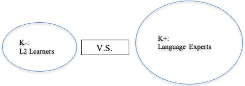 Drawing upon Heritage’s (2012) notion of the epistemic gradient among interactants, language experts are saliently more knowledgeable (K+) than less knowledgeable (K–) L2 learners. However, individuals’ epistemic stances are not invariable: they may alter from moment to moment due to interactional achievements (Heritage, 2012). Then, the conceptualizations of K– and K+ can delineate the knowledge discrepancy between learners and experts or the possible individual epistemic change from less knowing to more knowledgeable. Figures 2, 3 display different referents of K– and K+ employed in the present study.