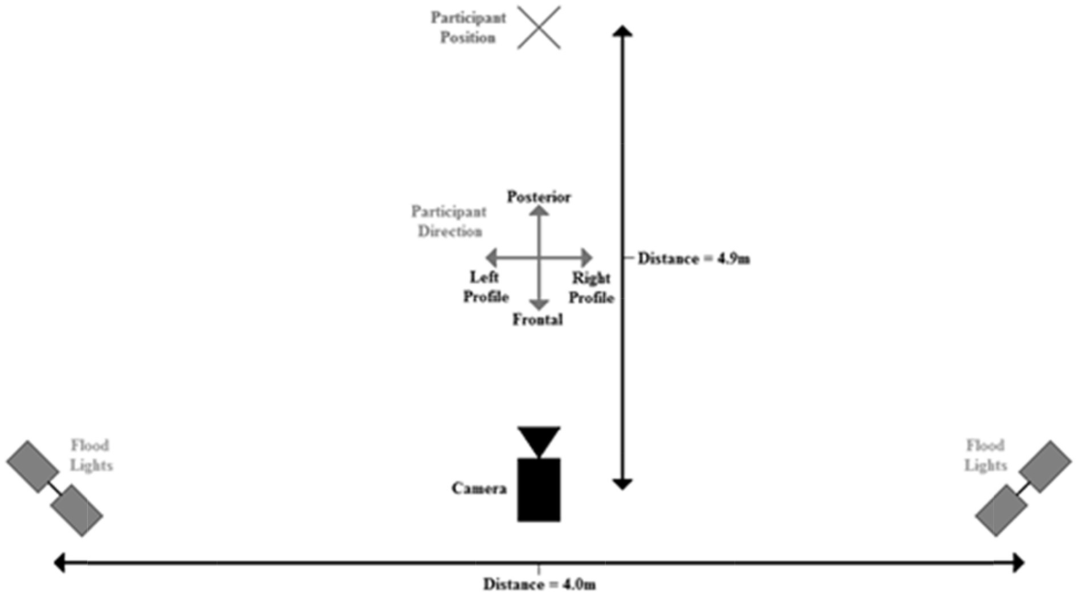 The stimulus actors were filmed individually performing within an indoor sports court at the university of the researchers. The location was kept constant, so each actor performed on the same surface with an identical backdrop. A fixed, tripod mounted, video camera (Sony HDR-FX1000E) was used to capture footage of actors, thus reflecting a first-person viewpoint. To maintain a constant level of lighting, two sets of 2 × 500 watt floodlights, mounted on stands at camera height, were placed adjacent to the camera on either side and aimed at the position where the actors were performing (Figure A1). All actors were young white/white passing adults from a range of gender appearances. These participants were selected to be the actors used in the test footage as they indicated their willingness to complete this task during the recruitment phase of this study. Each actor wore a short sleeve black shirt, black shorts, and sports shoes, with all the additional items such as watches, and hats removed.