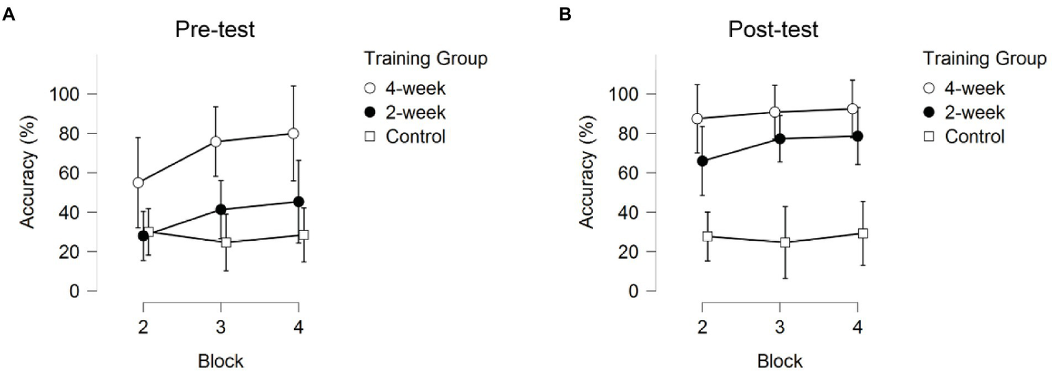 The Response Accuracy across the three blocks for the pre-test and post-test sessions. Error bars represent 95% CIs between groups. (A) after the term “pre-test” and (B) after “post-test”.