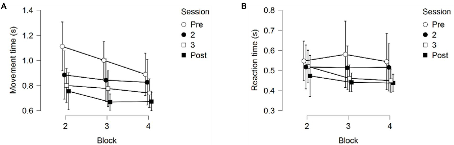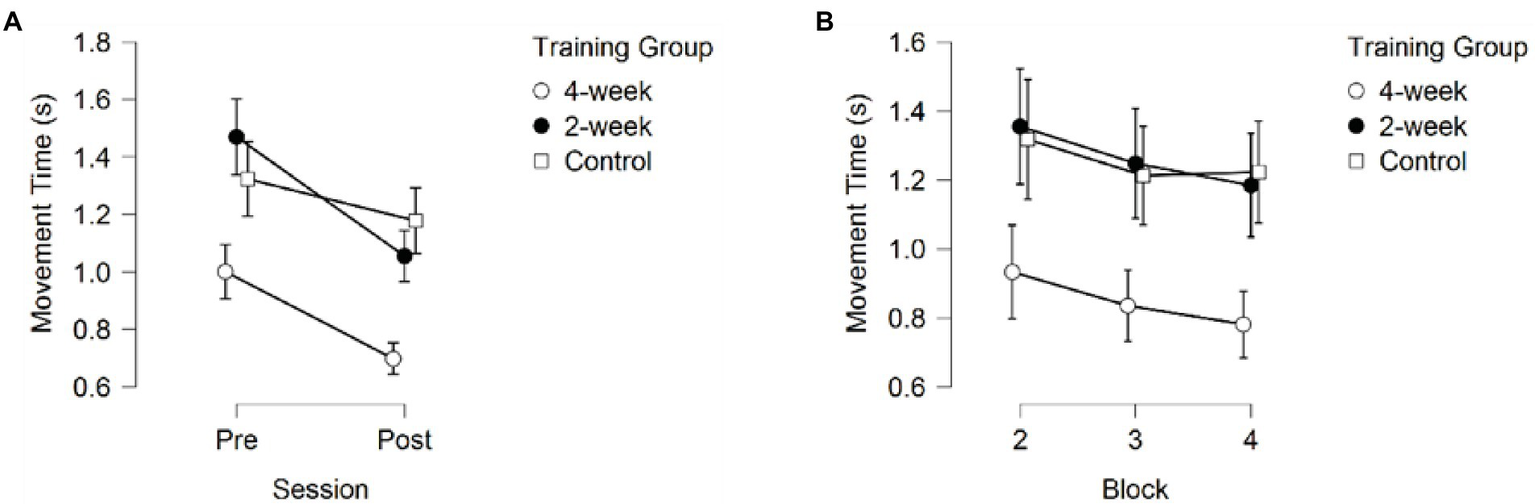 Movement time (A) across sessions, averaged over the three blocks (B) across blocks, averaged over the pre- and post-session. Error bars represent 95% CIs between groups.