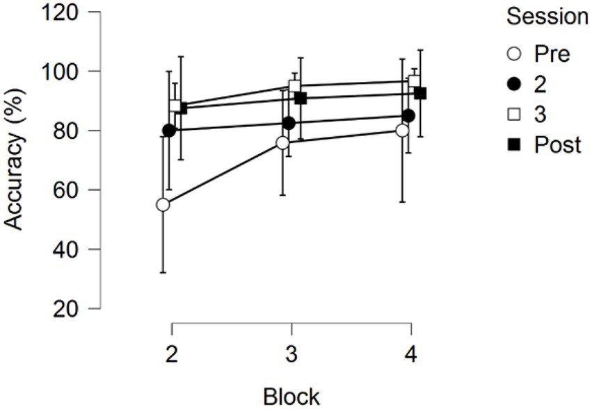 Response Accuracy across the three testing blocks for the four training sessions. Error bars represent 95% CIs.