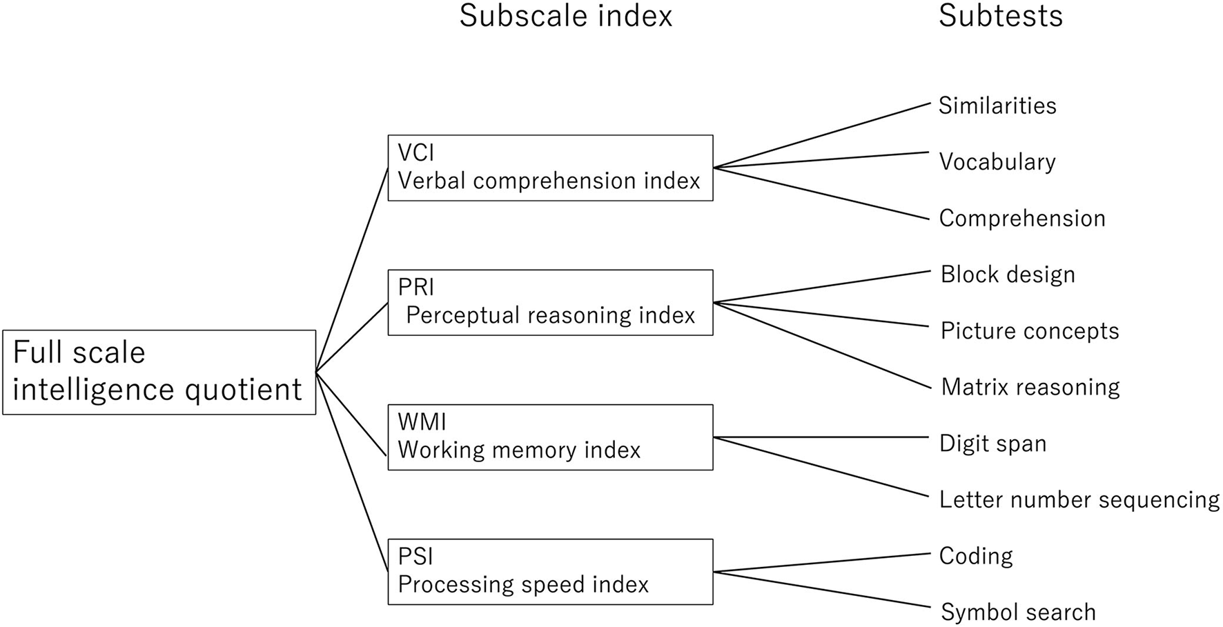 The Wechsler Intelligence Scale for Children Fourth Edition (WISC-IV) was used to measure the children's IQ. WISC was created in the United States and has been adapted for widespread use in different cultures around the world. It is not just a translation, but a development that takes into account language and culture, making it one of the most adapted tests in the world (Grégoire et al., 2008). Moreover, the WISC 3rd Edition has been used in 12 countries, including Japan and the U.S., to examine cross-cultural differences in intelligence testing, and results showed that the differences in intelligence quotients between cultures were insignificant (Georgas et al., 2003). The WISC-IQ is adjusted to place 50% of the population in the 90–109 range and has been revised every few years. The full-scale IQ (FSIQ), commonly referred to as IQ, is obtained by adding the scores of four subscales: verbal comprehension index (VCI), perceptual reasoning index (PRI), working memory index (WMI), and processing speed index (PRI). Each subscale index is calculated by adding the scores of two or three core subtests: VCI, similarity, vocabulary, and comprehension; PRI, block design, picture concepts, and matrix reasoning; WMI, digit span and letter-number sequencing; and PSI, sign and symbol search (Figure 1). Since the raw scores from each core subtest are adjusted for age to calculate the index score, if the raw score is the same as the previous year, the IQ will decrease. In this study, the scale was administered by a doctor who attended a training course organized by Nihongo Bunka Kagakusha, the publisher of the Japanese version of the WISC, and was qualified to administer the test. All the children were able to complete the core subtests, and no supplemental subtests were substituted.