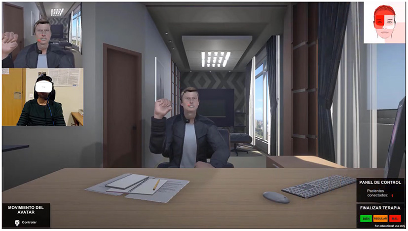 Traditionally, therapies aimed at remediating facial affect recognition deficits used pictures showing a range of emotions. However, facial movements, voice, and gestures are important cues for the recognition (Roark et al., 2003; Garrido et al., 2016; Pan et al., 2021; Tiwari et al., 2021) and regulation (Colombo et al., 2019; Shan et al., 2021; Wang et al., 2022) of affect. Therefore, virtual humans (VHs) overcome many restrictions on the use of static images through animation, or even videos, by offering an unlimited set of designs (avatars in the social context) to practitioners (Fernández-Caballero et al., 2017; García et al., 2018; del Aguila et al., 2021; Zhang et al., 2021). However, although virtual reality technology has been applied to treat communication disabilities (Bailey et al., 2021), autism spectrum disorder (Cai et al., 2013; Kuriakose and Lahiri, 2015), and psychotic disorders (Taubneblatt et al., 2019), among others, it still remains novel to many therapists.