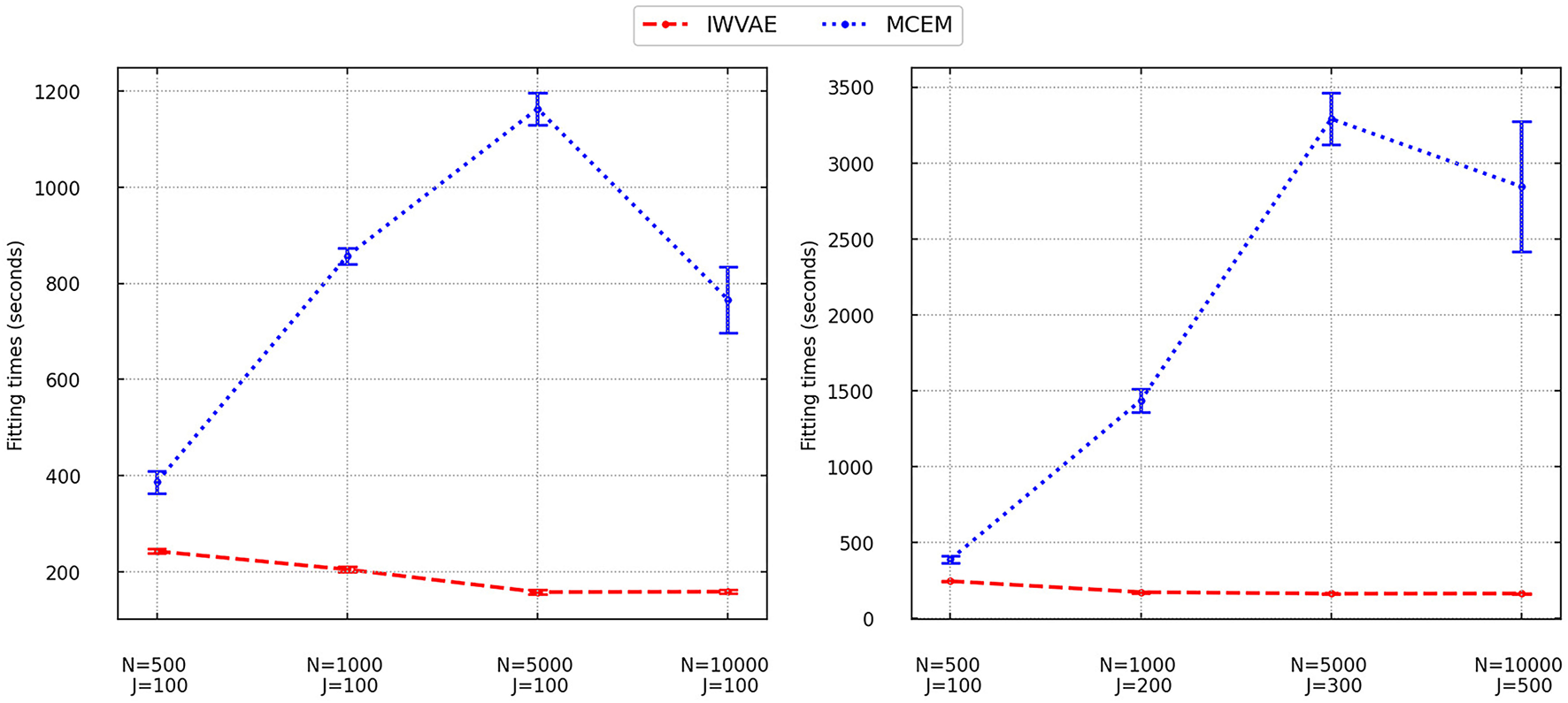 Our experiments were conducted as follows. First, we chose latent factors θi for i = 1, …, N to be uncorrelated and studied two asymptotic regimes. Specifically, in the single asymptotic regime, the dimensions of items J and factors K were fixed to 100 and 5 respectively, and sample size N was increased from 500 to 10,000. In the double asymptotic regime, only K was fixed to 5 and J was increased from 100 to 500 as N grew. Under both settings, we chose N ∈ {500, 1,000, 5,000, 10,000} and in the double asymptotic settings we further chose J ∈ {100, 200, 300, 500}. Under each combination of N, J, K, we evaluated performances of IWVAE, MCEM, and MHRM on the M3(4)PL model by checking item parameters Mp estimation. Finally, we duplicated this series of experiments to correlated factors settings.
