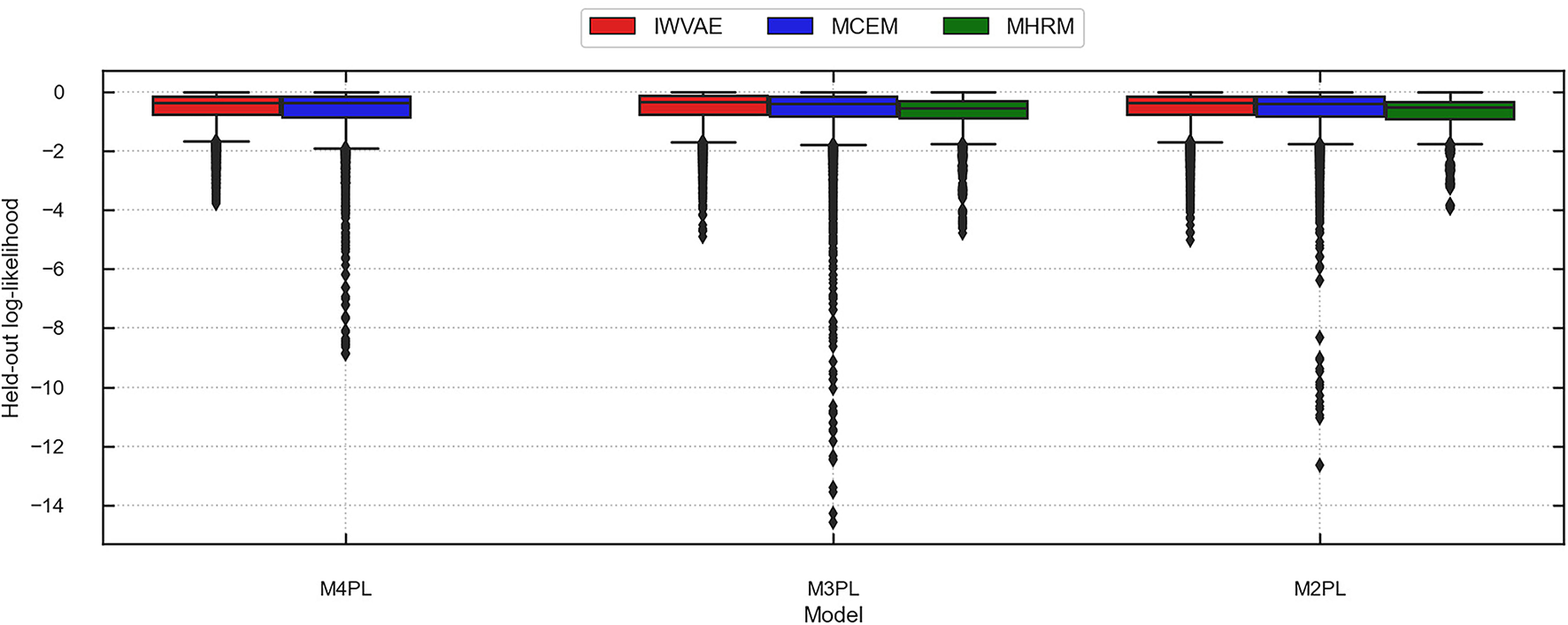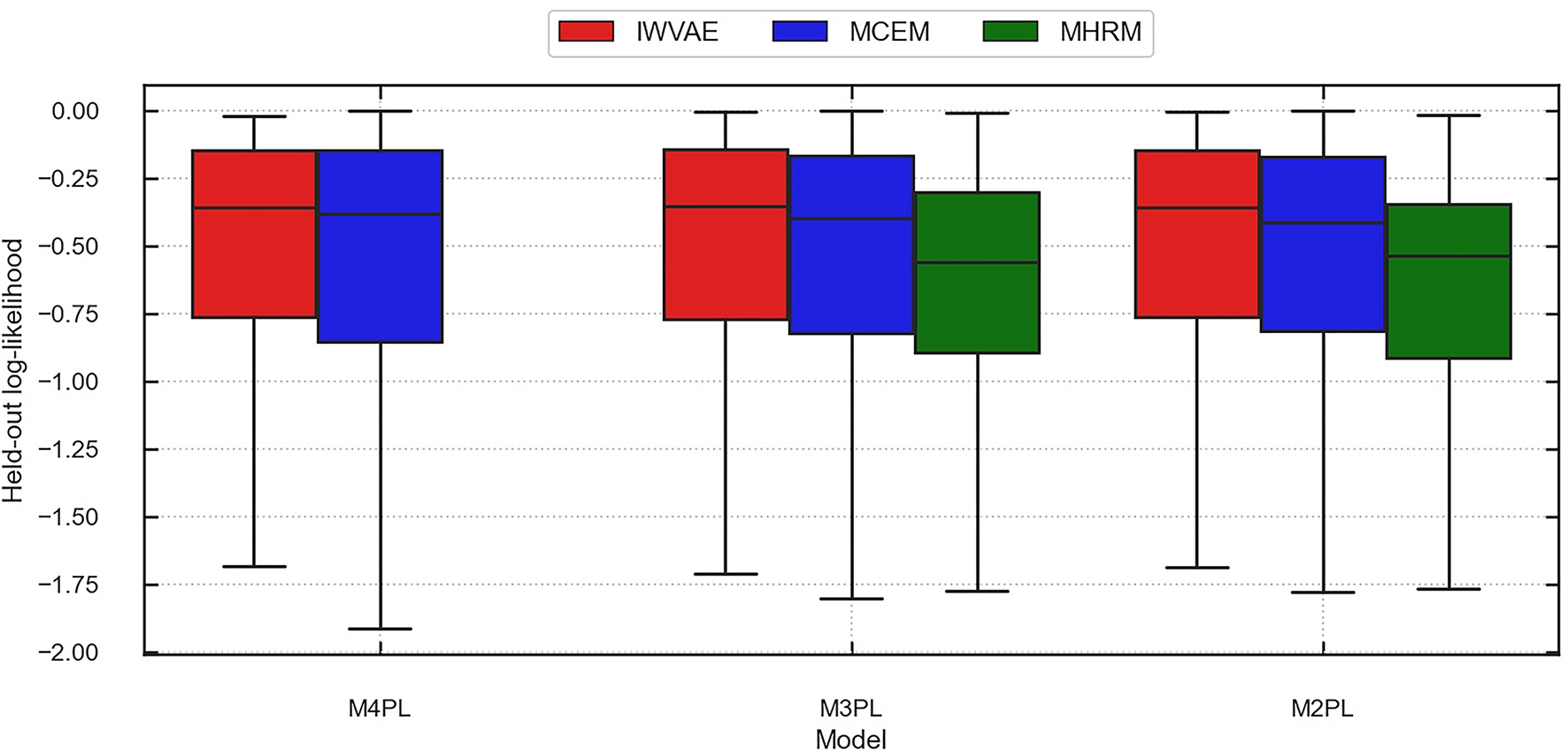 Finally, Considering that M3PL is notoriously hard for MHRM to fit (Cho et al., 2021), and M4PL is expected to be more difficult, we reported the success rate of each method, which refers to the percentage of successful replications. The exact definition of success for different methods differs. For MCEM, it refers to the case where the MCEM algorithm terminates and provides estimates successfully, regardless of convergence3. For IWVAE, it also refers to successful termination without reaching the maximum iteration number, which implies proper convergence. The difference in success, as we shall see later, is influential: MHRM usually performed the best if it succeeds. MCEM, on the contrary, had much worse performances while succeeding in all experiments.