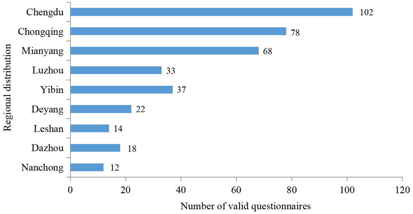 To ensure the reliability and validity of the scale, the data collection of this research was divided into two stages. The first stage was pre-testing, which began in June 2021 and ended in July 2021, we took professors, associate professors, doctors, and corporate alumni in the relevant fields of the author's university as the survey respondents, a total of 80 questionnaires were distributed, and 72 valid questionnaires were obtained. We used SPSS 22.0 software to conduct independent samples T-test, and the results showed that all items had good discrimination. The reliability analysis of the scale showed that the Cronbach α value of all variables were >0.700, which indicated that the design of the questionnaire had good reliability. Exploratory factor analysis was performed on all items, and the factor loadings of the rotating component matrix were all >0.600, which was in line with the expectations of the questionnaire design, and the questionnaire could be formally distributed. The second stage was the formal test, which began in September 2021 and ended in November 2021. Questionnaires were distributed to construction companies in the Chengdu-Chongqing economic circle (including Chongqing, Chengdu, Mianyang, Deyang, Yibin, Luzhou, Leshan, Dazhou, and Nanchong). With the help of college teachers, MBA students and corporate alumni, questionnaires were distributed by filling in on-site and by emails. We distributed questionnaires to 523 companies, 412 questionnaires were returned, and 384 valid questionnaires were obtained. The rate of valid questionnaires was 73.4%. As is shown in Figure 2, Chengdu, Chongqing and Mianyang are the main regions with valid questionnaires, the number of valid questionnaires in the above three regions accounted for 64.6% of the total.