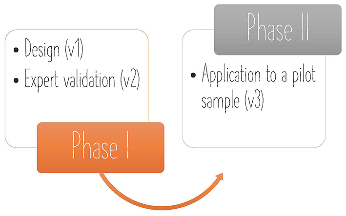 Phase I. Design and evidence of content validity using the expert judgment method. The first phase consisted of two parts. Firstly, an initial version (v1) of the questionnaires was designed by the leading researcher and secondly, evidence of content validity using the expert judgment method was obtained, after which a new version (v2) of each of the five questionnaires was available.
