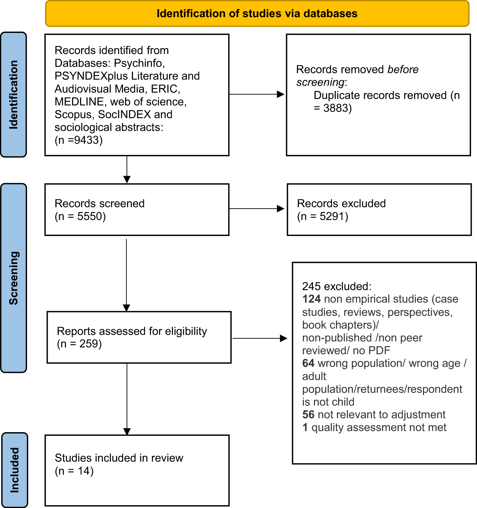This review aimed to capture all available English-language peer-reviewed journal articles on the adjustment of school-aged TCKs aged 5 to 18 years during their international stay. We included all published articles from the beginning of time until December 2021 across nine electronic databases: APA Psychinfo, PSYNDEXplus Literature, and Audiovisual Media, ERIC, MEDLINE, web of science, Scopus, SocINDEX, and sociological abstracts (Supplementary Datasheet 1).