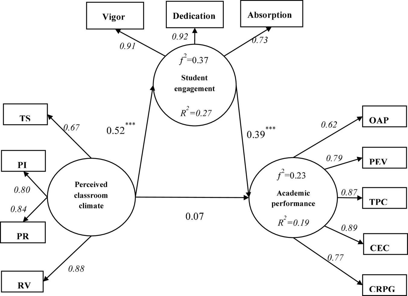 According to Hair et al. (2013), Cronbach’s α and composite reliability (CR) values should be higher than 0.70. In this study, Cronbach’s α values of the three scales for perceived classroom climate, student engagement, and academic performance were 0.93, 0.88, and 0.89, and CR values were 0.94, 0.89, and 0.89, respectively, which showed that the measurement tool had good reliability.
