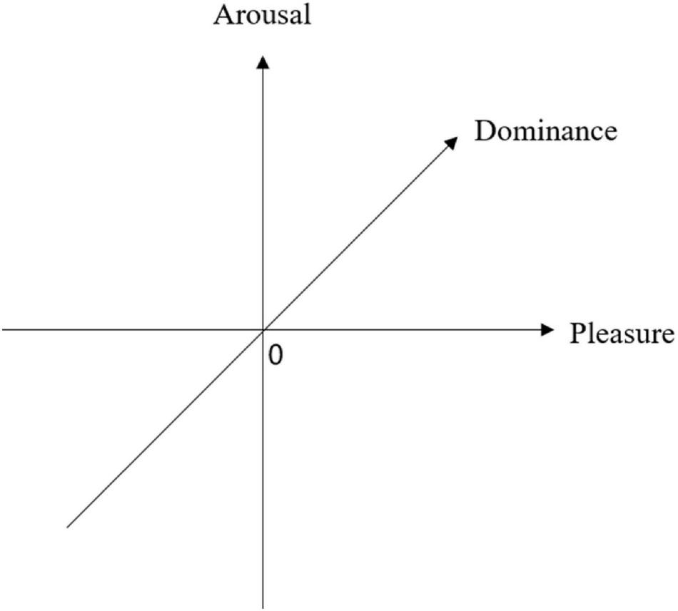 In the PAD Emotion Model, Pleasure ranges from extreme unhappiness to extreme happiness. Arousal is conceived as a feeling ranging from sleep to frantic excitement. Dominance ranges from submissiveness to dominance (Mehrabian and Russell, 1974). They developed three orthogonal scales of emotion: pleasure, arousal, and dominance (see Figure 1).
