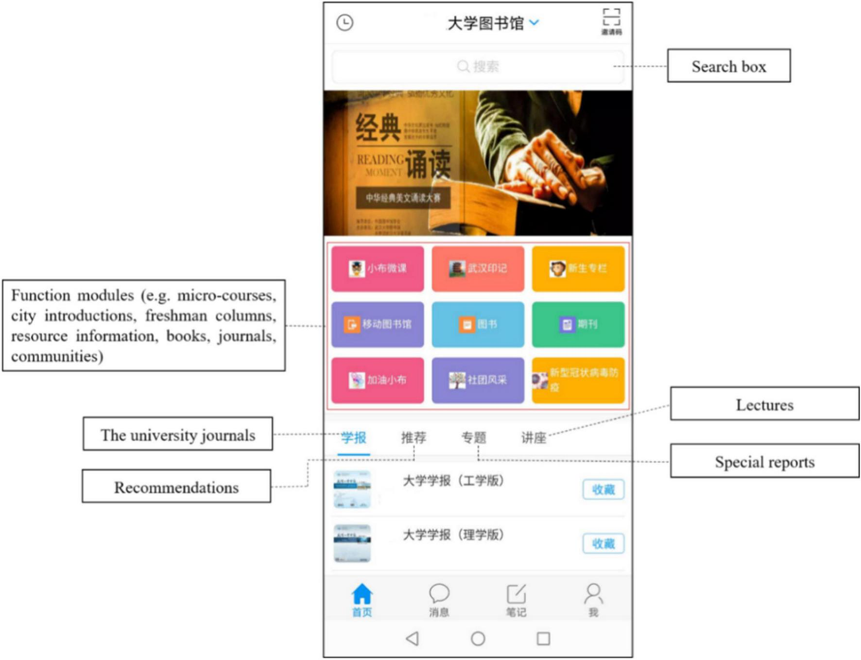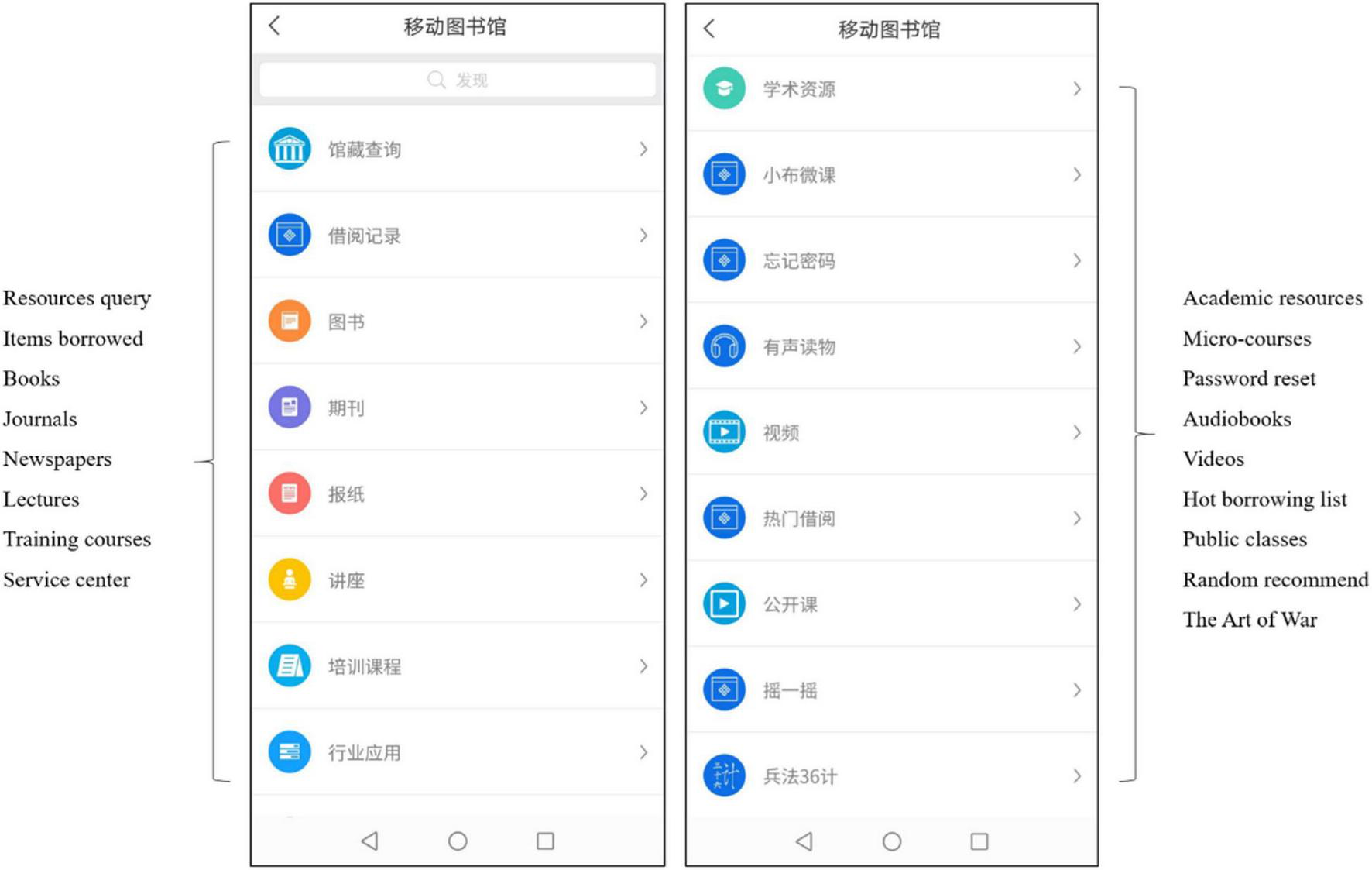 Mobile libraries, supported by mobile technology, play a key role in providing library services. In the mobile era, people are used to fragmentary reading (Zhao et al., 2016). For now, fundamental functions of mobile libraries are well developed. From the survey results of Ma and Dong (2020), many universities provide mobile libraries. Among the investigated subjects, 22 universities provide library mobile information services by Wireless Application Protocol (WAP) and 35 universities provide these services by applications. With technological advancement, people can acquire information anytime and anywhere with little effort.