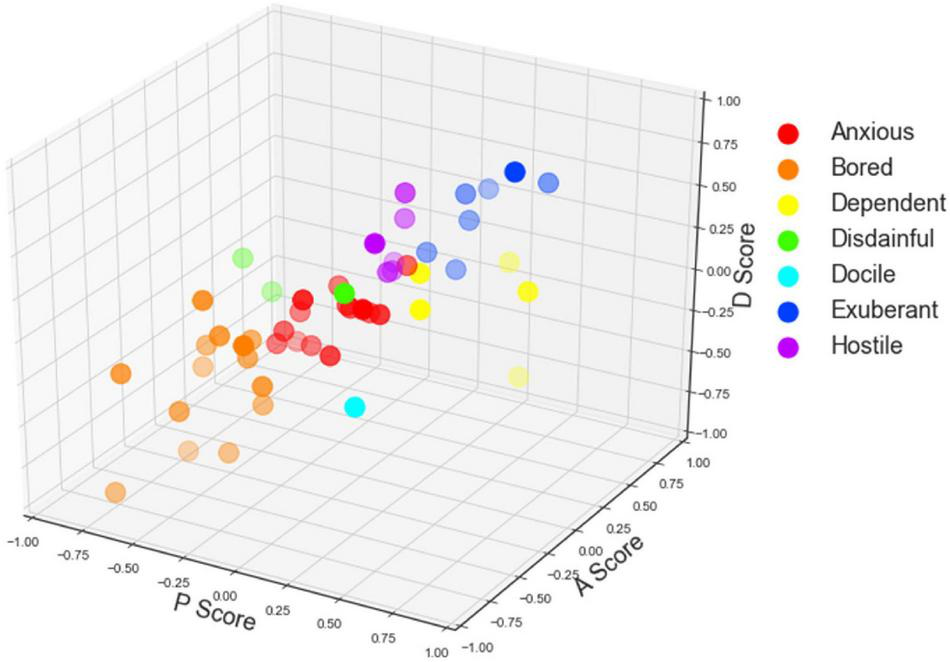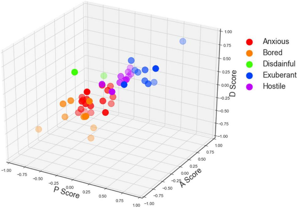 Gebhard (2005) used the mapping to calculate an individual’s default mood and verified that it was suitable for defining people’s personalities. Using time series methods, Mehraei and Akcay (2017) adopted the mapping to measure the initial mood of individuals when predicting the P, A, and D. Results show that all PAD can be predicted.