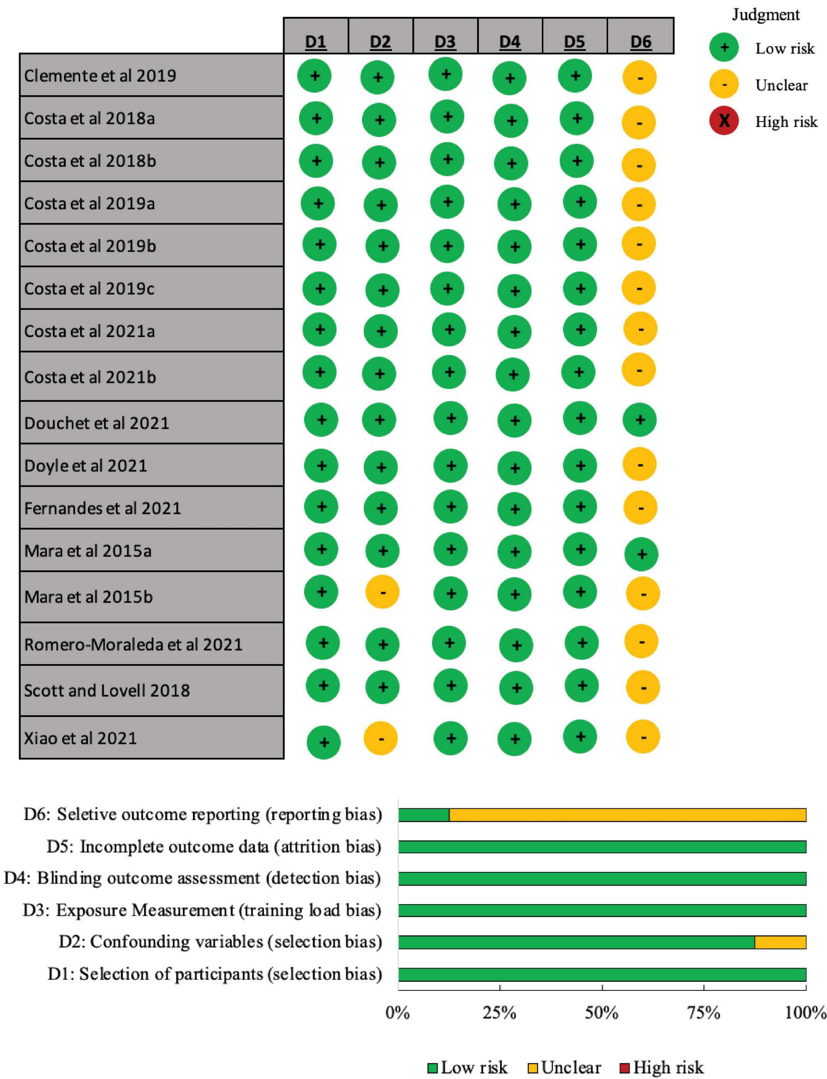 The âselection of the participant,â âexposure measurement,â âblinding outcome assessmentâ and âincomplete outcome dataâ were judged as low risk of selection of bias in 100% of the studies (Figure 2). For most of the studies (n = 14), the âconfounding variablesâ domain was judged as low risk of selection of bias (87.5%), with two studies being judged as unclear, due to unclarity on the type (i.e., content) of training sessions practiced per week. For most of the studies (n = 14) (87.5%) displayed unclear risk of bias to âselective outcome reportingâ domain, because the studies did not clearly describe the exact number of players considered for the respective statistical analyses. No studies were judged with high risk of bias for each domain.