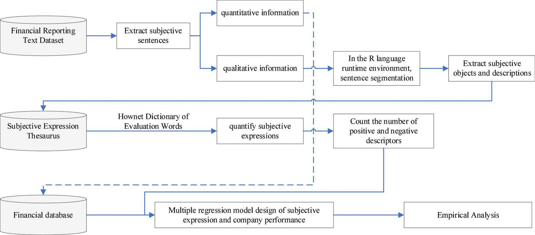 A purely statistical test of subjective expression in financial reports can only reveal that events have a certain impact on corporate performance, and cannot accurately measure the magnitude of the impact. For the latter purpose, it is necessary to carry out a regression analysis. This paper establishes a regression model to investigate the relationship between the emotions expressed in a company’s financial report and that company’s future performance (measured by return on equity). The specific research framework is shown in Figure 3.