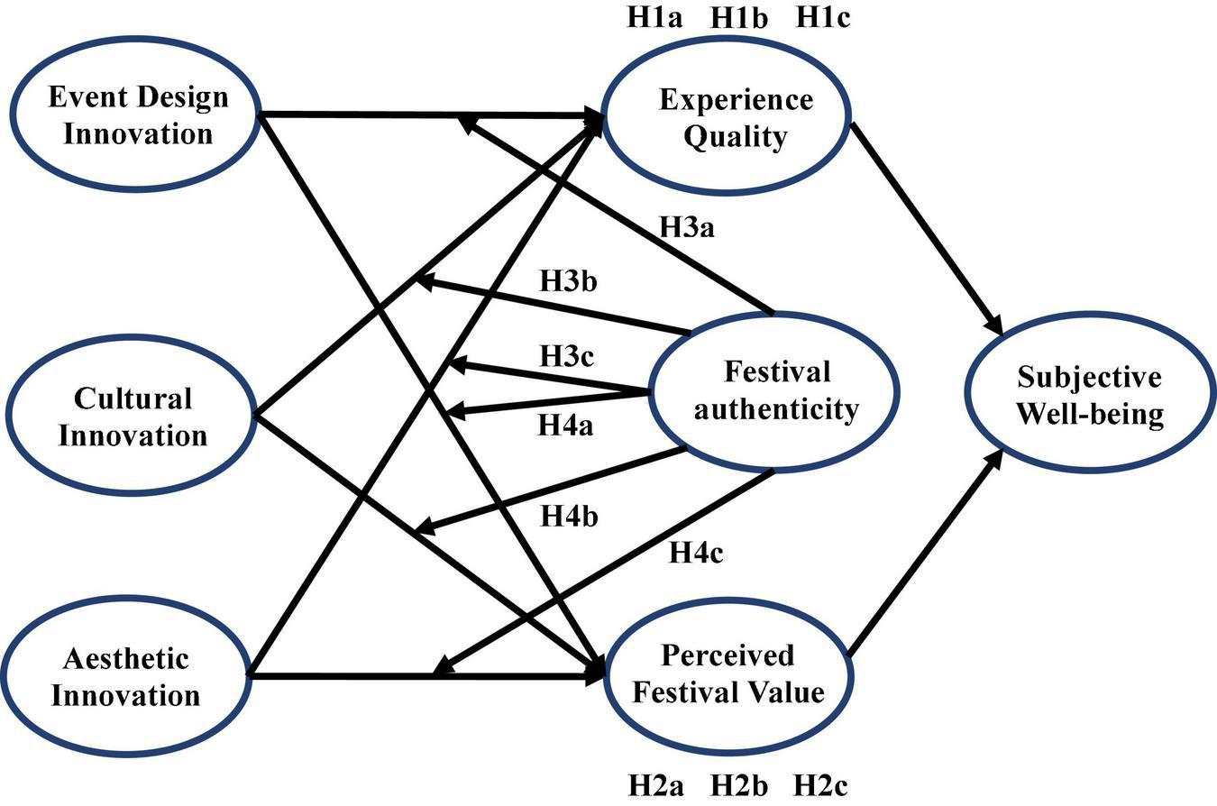 Hjalager (2010) argues that innovation always occurs in complex networks in order to satisfy many festival participants with various interests. Although it has to be acknowledged that innovation cannot cater to all visitors, competition between festivals and other experiential events is increasing (Hjalager, 2010; Gardiner and Scott, 2018). If the festival is not innovative, it will be more difficult to attract repeat customers, and its festival quality will be difficult to improve. Therefore, according to Arnold’s theory, this study considers festival tourism innovation as the positive stimulus condition. Under the stimulation of innovation, the cerebral cortex of tourists will perceive the elements of innovation and process information. Experience quality and perceived value are specific evaluation contents after stimulation (Chen and Chen, 2010; Aşan et al., 2020). The higher the experience quality and perceived value, the more positive emotions tourists generated, that is, the more likely they are to produce subjective well-being (Jin et al., 2015; Hussein and Hapsari, 2021). Furthermore, authenticity is another stimulus that distinguishes innovation in festival travel. Generally, exposure to authentic elements of festival culture contributes to a unique and high-quality experience for tourists (Akhoondnejad, 2016). This paper believes that festival tourism maintains a certain authenticity in the process of innovation. Therefore, authenticity, a moderator variable, plays a situational role between festival tourism innovation stimulus and “evaluation.”