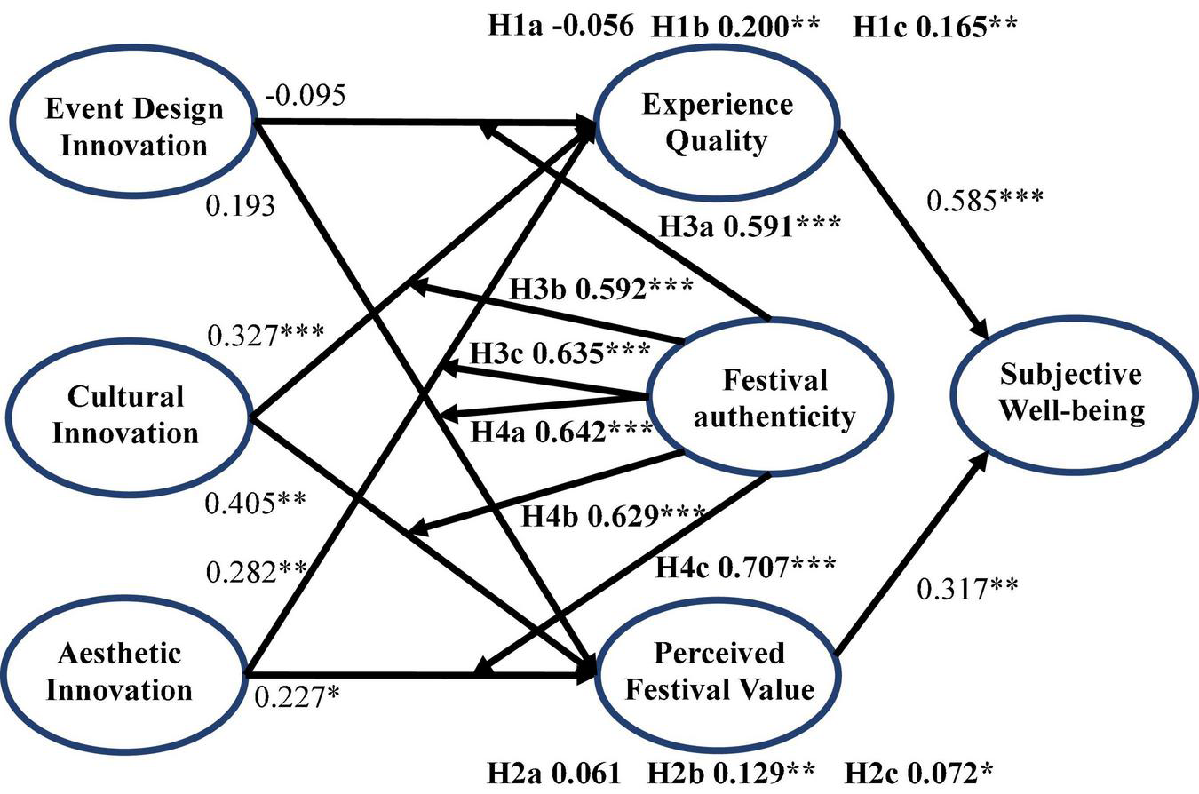 It is worth noting that the experience quality includes immersion, participation, surprise and fun, which are closely related to the positive psychology and behavior of tourists (Jin et al., 2015; Hussein and Hapsari, 2021). The pleasure and subjective well-being of tourists represent the best experience state (He et al., 2020). Cole and Scott (2004) point out that the positive experience of tourists has a certain cumulative effect, which can cause a leap in the emotional experience. The impact of experience quality may not stop at the level of shallow emotional responses. When positive emotions reach a certain level, tourists will have subjective well-being; that is, the experience quality may play an important role in the transmission of festival tourism innovation and tourists’ subjective well-being. Therefore, we propose the following hypotheses: