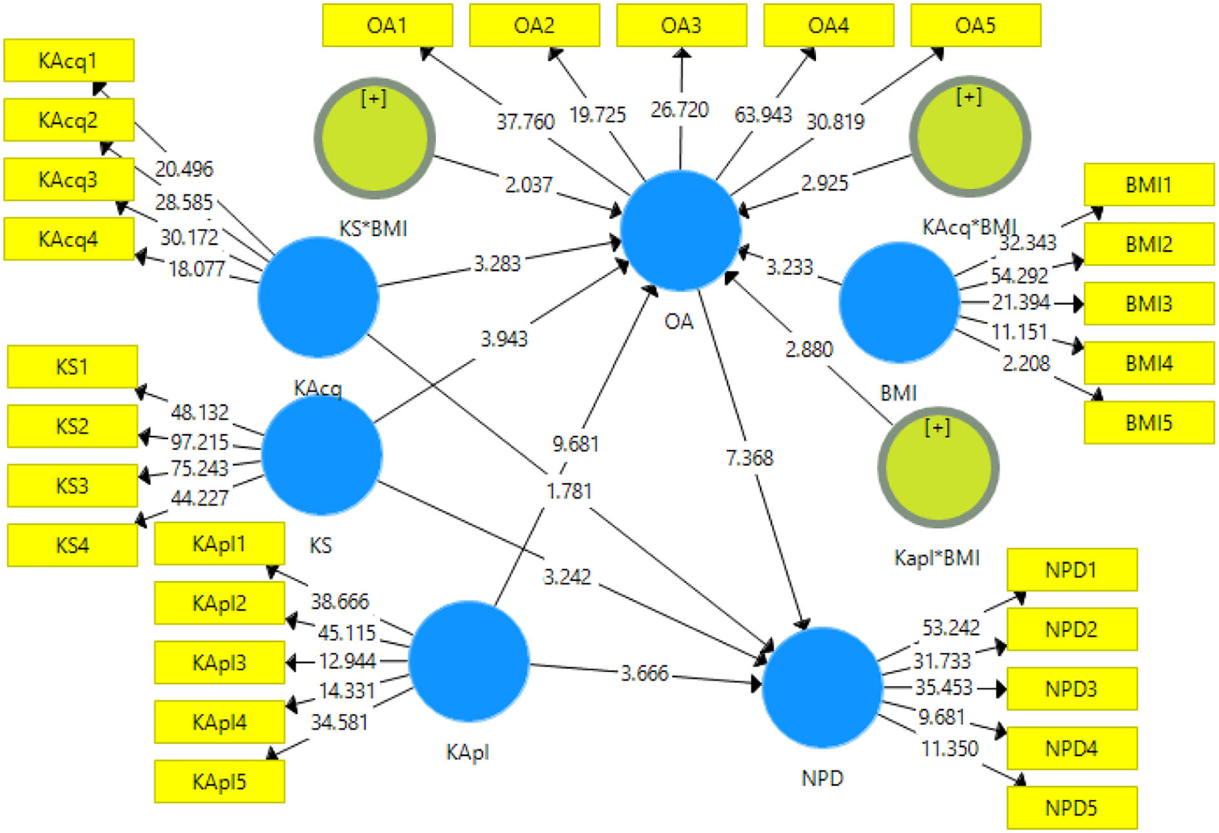 To examine the relationship within the variables, a structural model analysis was conducted. This study adopts the bootstrapping method to examine the significance of path coefficients (see Figure 3). Results indicated that knowledge acquiring capability has no significant association with the performance of new product development. Therefore, H1 is not accepted. Moreover, results revealed that knowledge sharing is significantly and positively related to new product development performance (β = 0.272, t = 3.242), and H2 is supported. Moreover, knowledge application and organization agility are significantly and positively related to job new product development performance, and H3 and H4 are supported. The bootstrapping process specified the mediation effects. The findings show that organizational agility significantly and partially mediates the relationship between knowledge acquiring new product development performance (β = 0.169, t = 3.458), and H5 is supported. Results also indicate that organizational agility significantly and fully mediates the relationship between knowledge sharing and new product development performance (β = 0.105, t = 2.109), and H6 is supported. Results revealed that organizational agility significantly mediates the relationship between knowledge application and new product development performance (β = 0.087, t = 2.544), and H7 is supported.