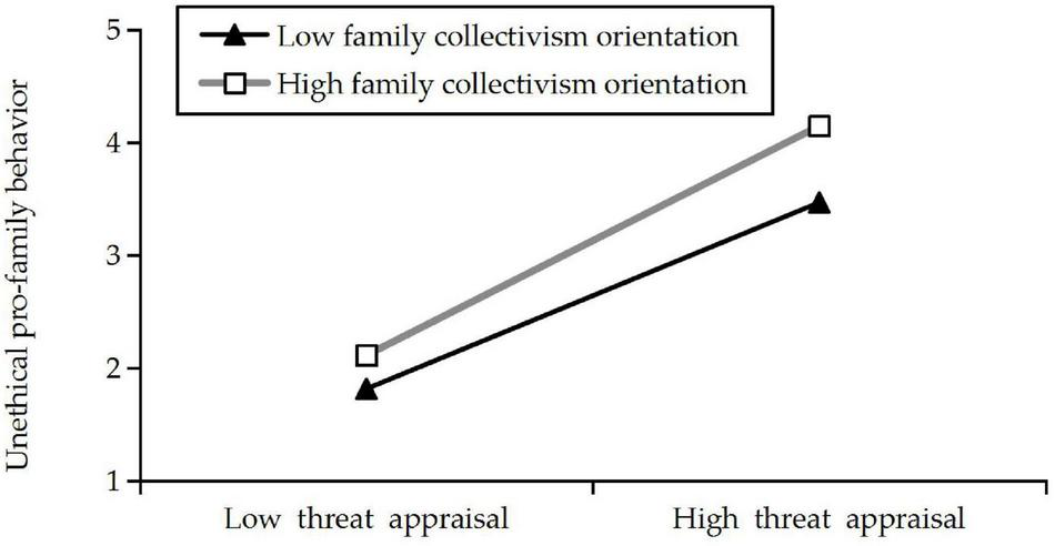 People devoted to family collectivism have demonstrated high levels of identification with their families (Hofstede, 2006). Consequently, they put an interest in their families over individual interests. People who have invested a good amount of time or effort into their work roles also could orientate toward family collectivism if they believed that their hard work would benefit the family (Zhang et al., 2019). Family collectivism has been characterized as an ideology that encourages people to treat hard work as a necessary method that yields monetary resources to benefit their family (Yang et al., 2000; Zhang et al., 2019). Studies have demonstrated that these people adhere to these beliefs as they develop their roles at work and in the family (Yang et al., 2000; Zhang et al., 2014, 2019). Ollier-Malaterre and Foucreault (2017) also noted that individuals in collectivism cultures reported less work-family conflict than individuals in individualistic cultures. When people who value family collectivism conduct an appraisal of the work-family conflicts that they experienced, they may not perceive threats because the fulfillment of their work roles benefited their families (Zhang et al., 2019). Therefore, a person’s high levels of family collectivism are not necessarily related to an appraisal of greater threat from WFC. However, once a threat appraisal has been performed, people with greater orientation toward family collectivism tended to have a stronger motivation to engage in UPFB; they believed that the purpose of their actions would be to contribute to the welfare of their families (Tatliyer and Gur, 2021). Individuals will feel guilty and ashamed emotionally after engaging in unethical behaviors in the family, and subsequent unethical behaviors in the family due to guilt and shame are inhibited. Therefore, we suggest that the relationship between threat appraisal and UPFB is moderated by family collectivism orientation. We propose the following: