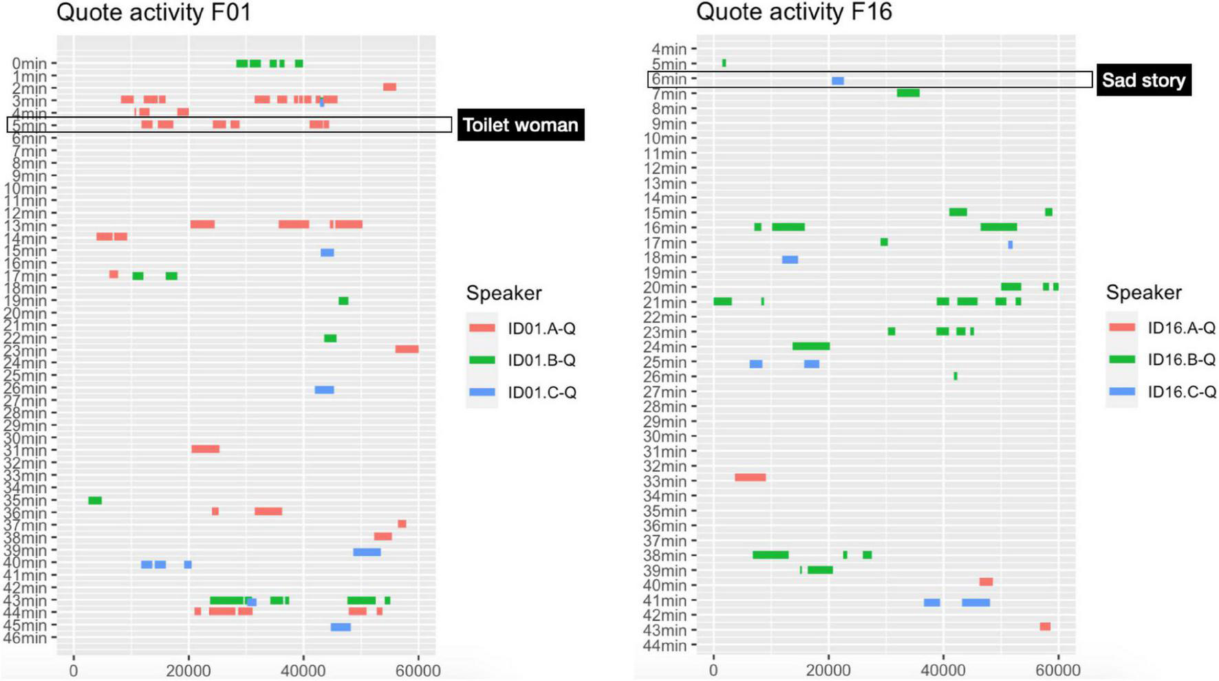 As noted earlier, quotations are exhaustively annotated during transcription in ELAN. Given their annotation on a separate tier they not only have exact temporal properties but can be automatically retrieved. The annotation of quotation also includes so-called silent quotes, that is, depictions of non-verbal behavior that do not occur co-speech (cf. Hsu et al., 2021).