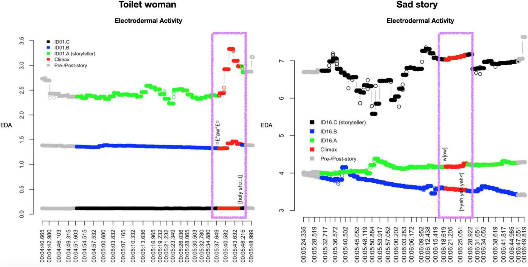 A distinction is commonly made between tonic and phasic EDA, the former referring to “the average level of skin conductance, resistance or potential in a given situation” (Lykken and Venables, 1971: 657) and the latter referring to “transient, wave-like changes which may be elicited by external stimuli or may be ‘spontaneous,’ i.e., elicited by internal events” (Lykken and Venables, 1971: 657).6 In the present research, the focus is on phasic EDA, as, based on the notion of emotion contagion, the prediction is that the storyteller and the recipients will exhibit roughly synchronous EDA responses at a short predefined interval, namely the Climax, with the storyteller’s EDA response elicited by the internal stimulus of reliving of the events depicted at Climax, and the recipients’ response elicited by the storyteller’s telling about the climactic event. The predicted synchrony at Climax is expected to be moderated by onset latency, which is typically 1–3 s (Dawson et al., 2000: 206). Another possibly moderating (or even confounding) factor is the substantial inter-subjective variability in EDA responsiveness, which may be due to physiological or psychopathological conditions (Lykken and Venables, 1971; Dawson et al., 2000). Within these limits of inter-individual differences, the intensity of an EDA response and, hence, the intensity of emotional arousal can be read off the responses’s amplitude, with large amplitude increases indicating high-intensity arousal (Bailey, 2017: 8).