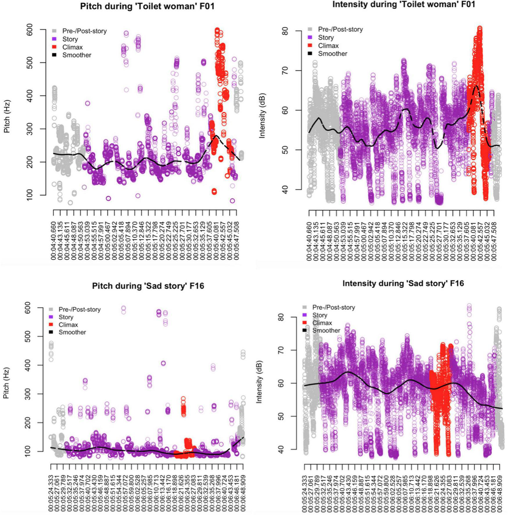 The two storytellings under scrutiny were subjected to prosodic analysis in Praat, a widely used phonetic analysis tool (Boersma and Weenink, 2021). A script written by David Weenik helped extract from the storytellings synchronized intensity and pitch values. Scatter plots with overlaid locally weighted regression lines were used to analyze the coincidence, or lack thereof, of pitch and intensity peaks with the respective story Climaxes.