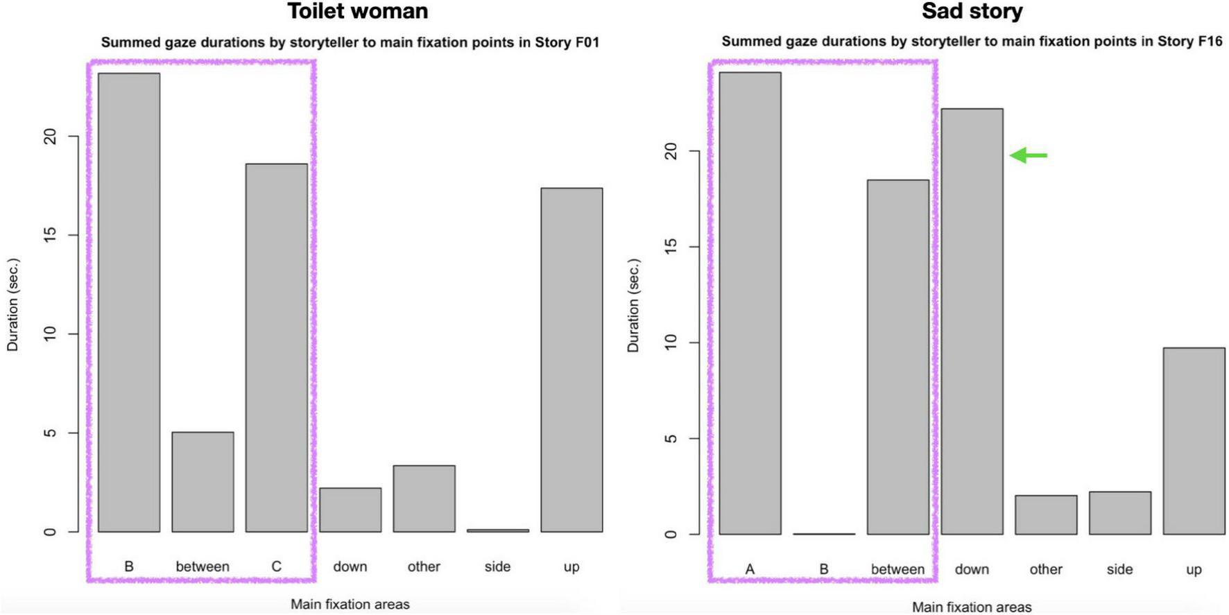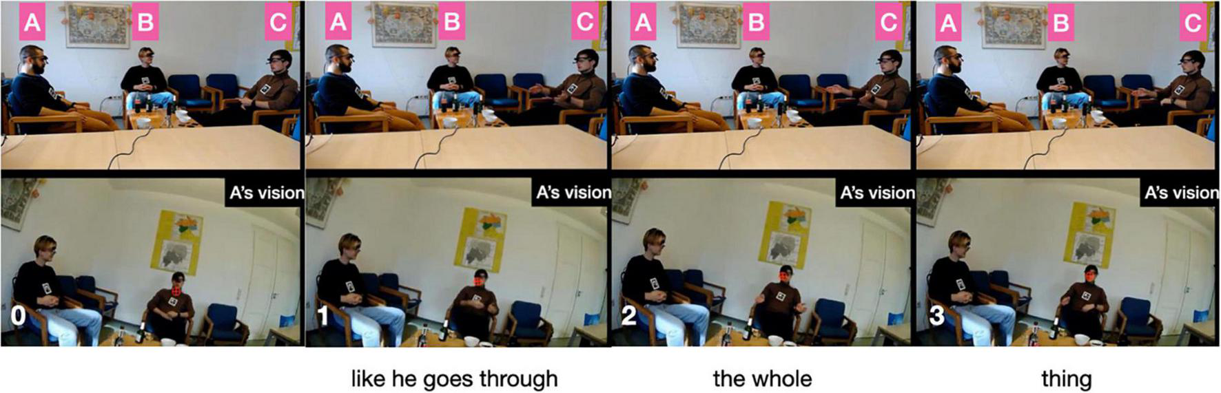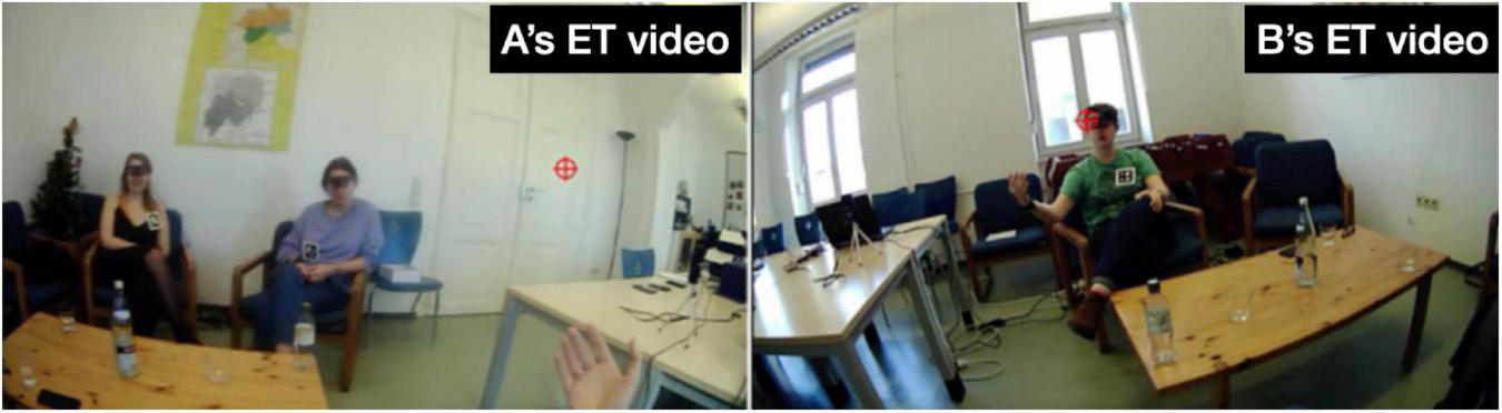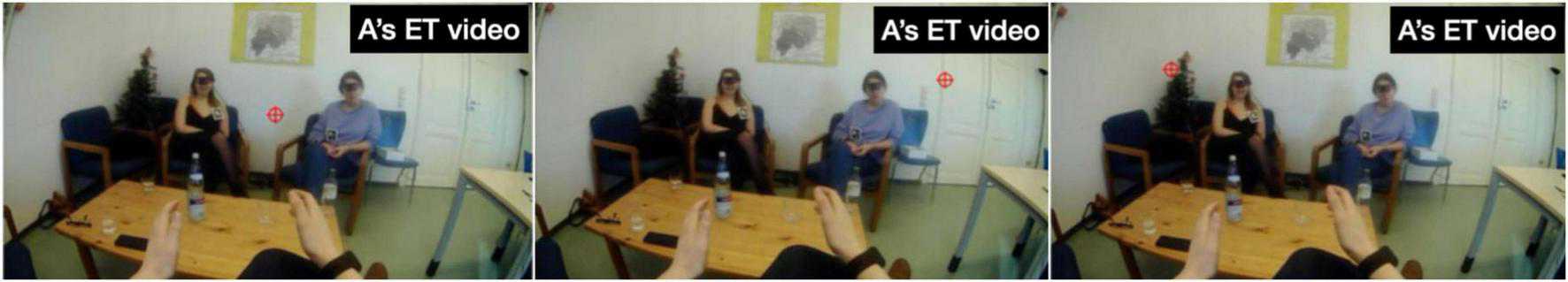 The participants wear Ergoneers eye tracking glasses recording their foveal vision, that is, the field of vision with greatest visual acuity (e.g., Auer, 2021). A distinguishing feature of the Ergoneers eye trackers is that researchers have access to the eye camera videos. The benefit of this accessibility is that missing or erroneous pupil detections can be manually corrected. As this manual correction is done frame-by-frame it is time-consuming and cannot be afforded for large-scale analyses. However, for the present study, in which selected storytellings were analyzed, pupil detection was manually corrected.