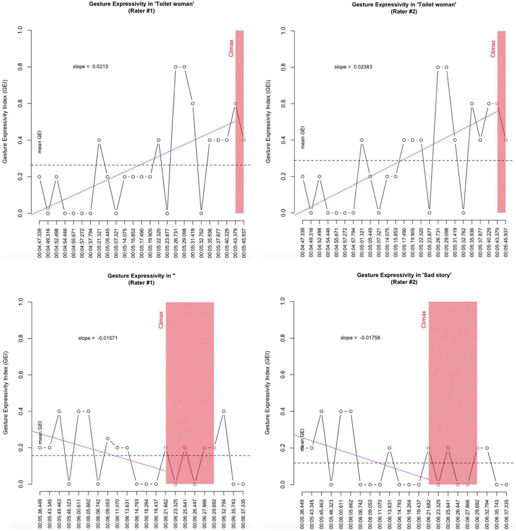 The Index is computed for each gesture as the average value on all five variables. Given that variable values are either 1 or 0, GEI values range between 0 and 1, with values close to 1 signifying substantial expressivity and values close to 0 signifying weak expressivity. To establish the overall expressivity across the storytelling as a whole, a grand mean is computed (termed mean GEI). To obtain a metric that indexes the gestures’ expressivity development across the storytelling, a linear regression is calculated based on the Index values of all gestures occurring prior to the Climax (thus excluding gestures and their GEI values occurring in mid-Climax or post-Climax position). Crucially, expressivity development is inferred from the slope of the regression: a positive slope value is seen as indexing intensifying expressivity toward the Climax; small or negative values indicate the gestures become less expressive as the telling approaches its Climax.