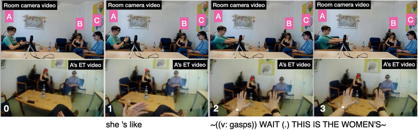 The data for this study come from the Freiburg Multimodal Interaction Corpus (FreMIC) currently under construction at Freiburg University with funding from the DFG (project number 4141532663). At present, the corpus contains roughly 20 h of video-recordings of unscripted conversation in two- to three-participant settings.