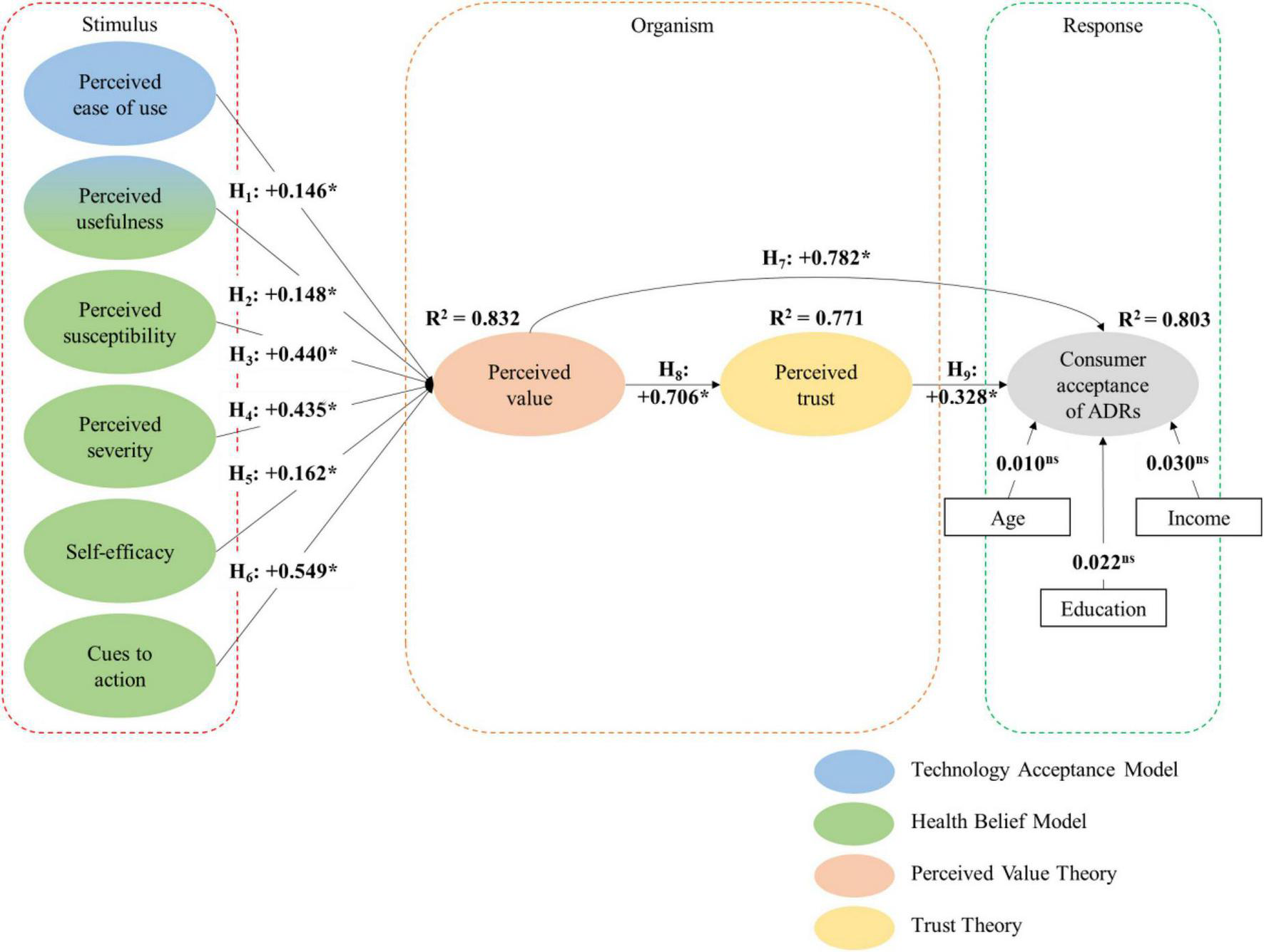According to Castelfranchi and Falcone (2010), perceived trust (TRU) is the belief that a trustee with specific attributes will provide positive results for the trustor by performing certain actions. In other words, positively perceived TRU is created when the benefits outweigh the associated costs (Yuen et al., 2020a). The trust theory is also applied in this study. In short, both the perceived VAL theory and trust theory are applied in the SOR framework of this study as “organisms” to investigate how perceived VAL and perceived TRU influence consumer acceptance of ADRs.