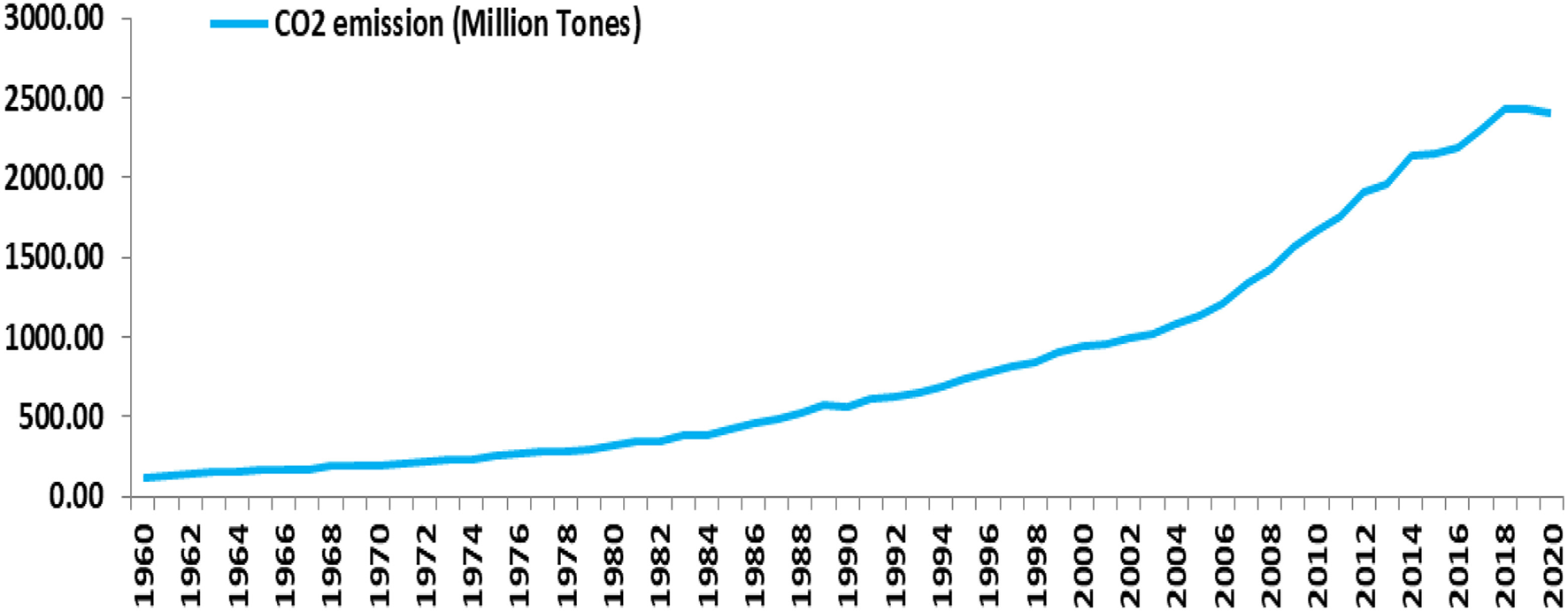 Carbon dioxide emissions jumped from 120.58 million tons in 1960–2411.7 million tons in 2020 (Figure 1) resulting in manifold effects in different sectors of the environment. In general, it results from the combustion of many non-carbon dioxide greenhouse gases like CFCs, methane, and nitrous oxide along with fossil fuels which play a greater role in global warming. The per capita CO2 emission in the case of India was 1.74 tons in 2020. The year-wise review indicates a huge jump from 0.38 tons in 1970 and an annual increasing rate of 9.83 percent until 2009, after which it registers a declining rate of −6.91 percent until 2020. While this emission trend of CO2 accelerated plant growth, it had no positive impact on the grain fills. As a result, the productivity of crops, especially cereal crops (major crops of India), declined as CO2 levels increased, thereby affecting the nutrition use efficiency negatively. Similar results are also found in the study by Amponsah et al. (2015) conducted for assessing the effect of CO2 emission on cereal production in Ghana. Another research revealed that an increase in CO2 levels accentuated the summer dryness which in turn reduced the yield of C3 crops by 10 to 30 percent because they are highly vulnerable to carbon dioxide concentrations (Senapati et al., 2013).