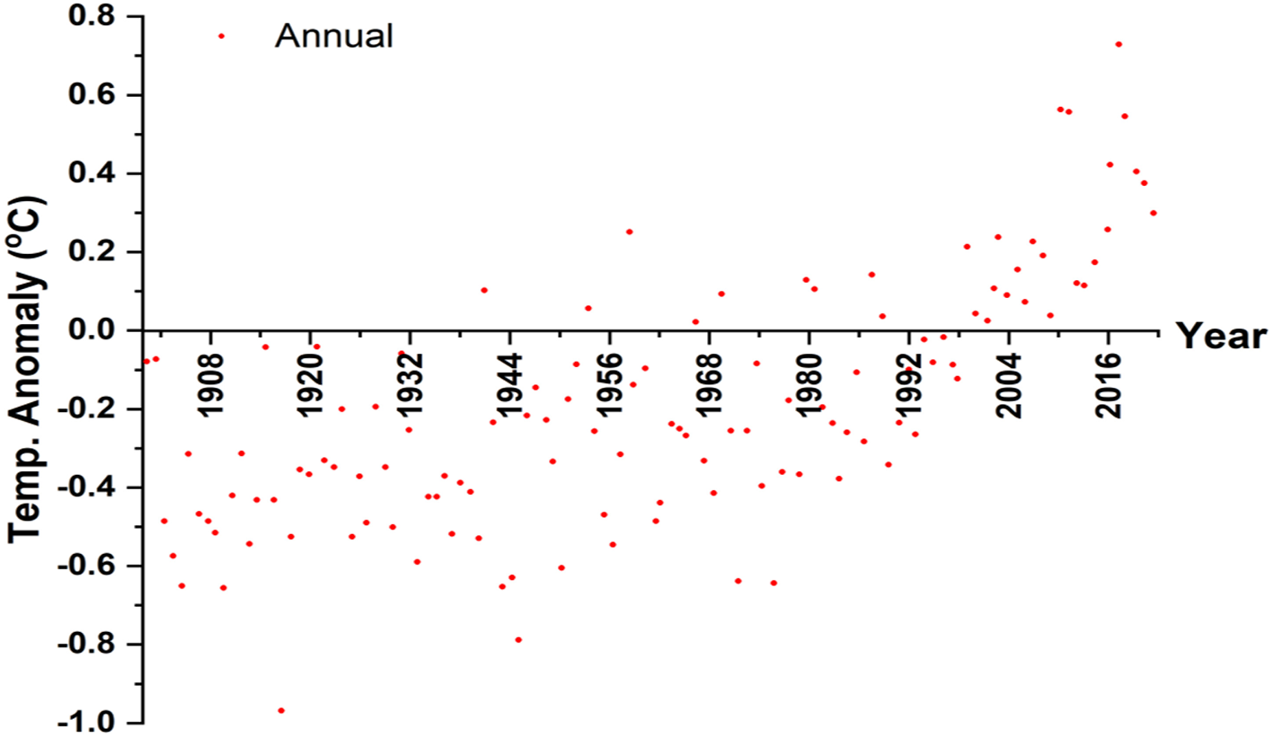Figure 2. Annual average air temperature anomalies on land surface from 1901 to 2020 with a base period of 1981 to 2010.