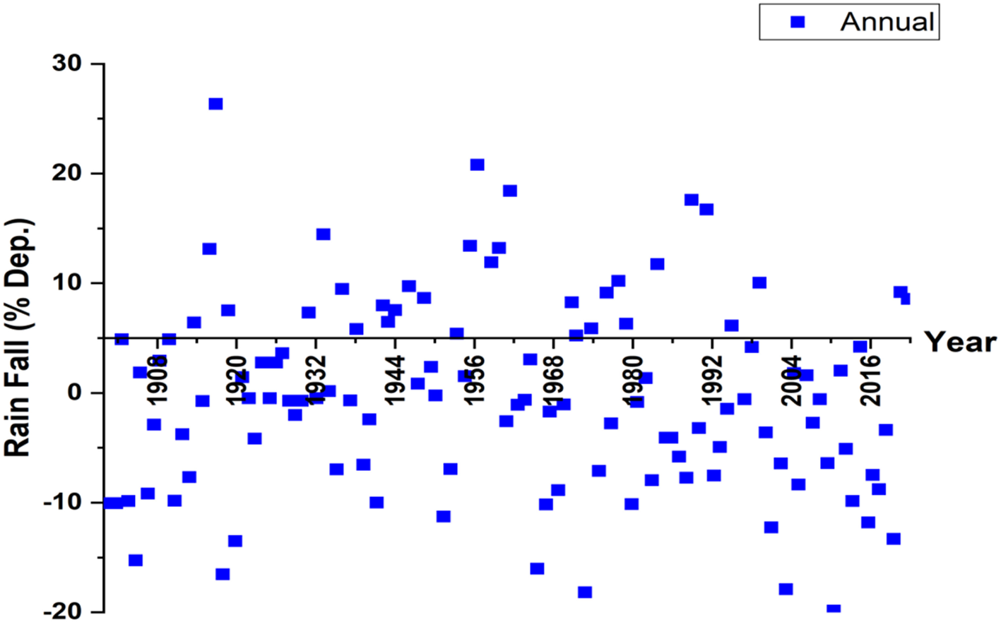 A similar trend analysis of rainfall shows that 109% of annual rainfall over a long duration provides 117.7 cm of rainfall. In Figure 3, the time series analysis of the percentage departure of yearly rainfall all over India is depicted. During the peak rainy season i.e., Southwest monsoon period between June to September, seasonal rainfall was received in the four broad geographical regions of central India (115 %), southern peninsula (129 %), east India (106 %), and northeast India (106 %). However, the sharp declining rate of rainfall over the past 10 years has resulted in a rising number of dry years causing major alarm, especially in the rainfed-agriculture states. These results are similar to the studies undertaken in Odisha that explored how a decline in monthly rainfall has raised concern among farmers.
