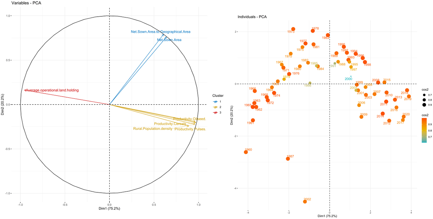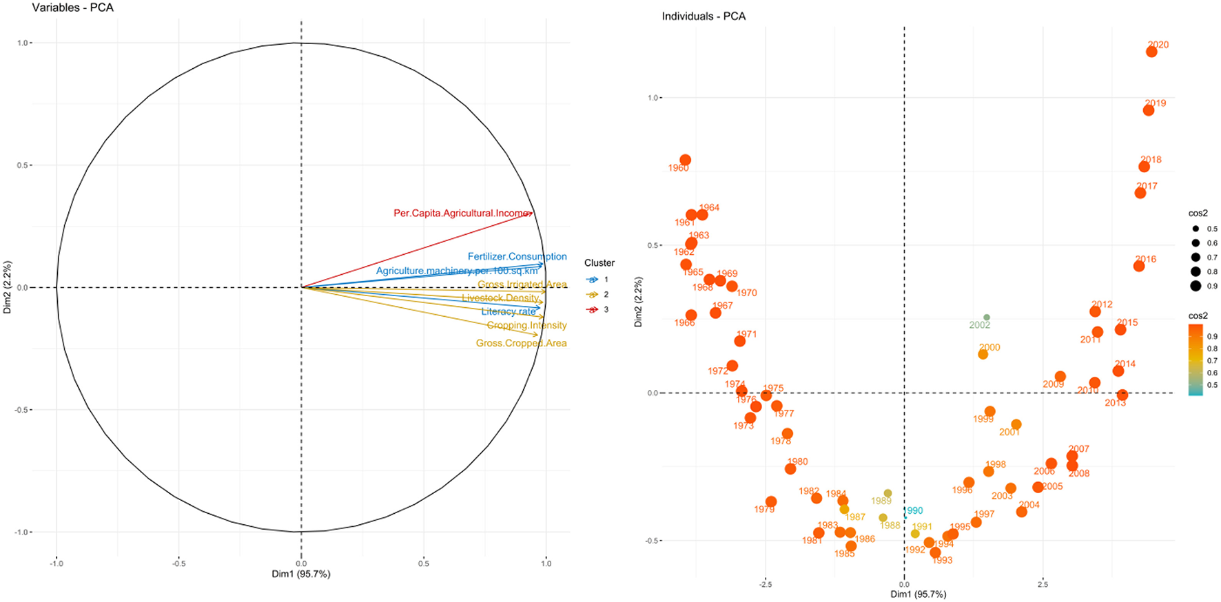 Within the eight adaptive factors, cropping intensity, agricultural machinery, and livestock density contributed the maximum and were principally accountable for variations in the PC1. In this case, the ind.biplot revealed that the adaptive components were not stable when compared year-wise, hence were more prone to vulnerability, and the same was found in the case of sensitivity indicator components. On the sensitivity indicator, its six factors were aggregated to one principal component because it explained more than 75 percent variation having eigenvalue 5.26 (>1), and the PC1 non-rotated loading values showed that average operational land holding size and the productivity of cereals factors contributed to a major portion of the variation in PC1. This suggests that crop and livestock production have a higher vulnerability, especially in rural environments as seen in Tables 4, 5.