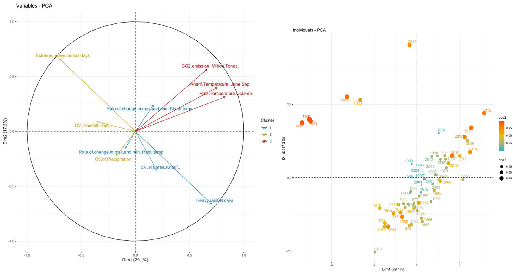 When exposure indicator components were analyzed through PCA, slightly different results were obtained for the first four principal components (PC1 to PC4), which cumulatively contributed to more than 78 percent of total variation hence the non-rotated factor loading which would exactly depict the contribution of the variables were used at the levels of the four principal components. The ind.biplot of the exposure components showed that they were comparatively stable from 1989 to 2005 showing stable performance. This finding shows that the critical factors (with factor loading greater than 0.4) in the case of the exposure indicator were kharif temperature, heavy rainfall, and rate of change in maximum and minimum rabi temperature.