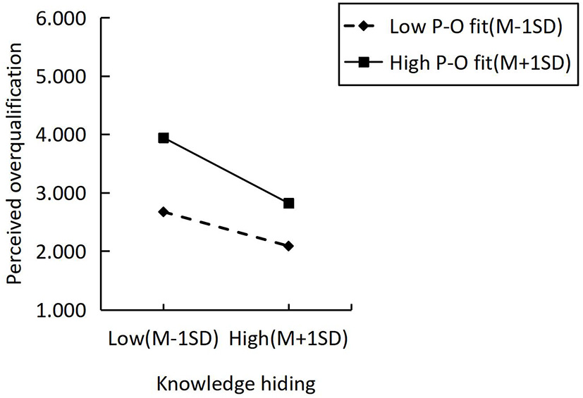 Further, the literature suggests that the employee psychological capital is positively associated with a perceived organizational support climate (Luthans et al., 2008). They propose that a supportive environment may help the psychological capital to flourish among employees. A supportive environment may make workers more resilient and hopeful, encouraging them to actively respond to setbacks and try new methods in their work. Wang and Xie (2021) also expounded on the effect of organizational atmosphere on employees' knowledge hiding in their research on organizational motivational climate. Organizational motivation atmosphere includes two dimensions: organizational control atmosphere and organizational performance atmosphere (Nerstad et al., 2013), among them, the organizational control atmosphere attaches importance to the sustainable development of individuals, encourages individuals to learn from themselves and colleagues to learn from each other, and establishes the common destiny among employees (Ntoumanis and Biddle, 1999). In the controlled atmosphere of an organization, the standard of employees' success is concerned with self-ability improvement, which encourages colleagues' mutual learning and grow together (Ntoumanis and Biddle, 1999). In this atmosphere, individuals hiding their knowledge is not conducive to group achievement, and individuals does not have to worry about sharing knowledge in the high personal-organization fit and organizational emotion (Černe et al., 2014). As a result, individuals are willing to make progress together by sharing their experiences or insights. In a similar vein, it is easy to establish trust during an interaction, mistrust is a key factor in knowledge concealment in a collective (Connelly et al., 2012), and trust can significantly reduce knowledge hiding behavior among members (Zhao and Xia, 2019), this is consistent with the mechanistic theory of personal-organization fit. According to social information processing theory, an important characteristic of humans is adaptability, and individuals adjust their behaviors and attitudes according to the information provided by their surrounding environment (Salancik and Pfeffer, 1978). Thus, we believe when there are higher levels of personal-organization fit; individuals with higher levels of overqualification are more inclined to share knowledge with others. We put forward the following hypothesis: