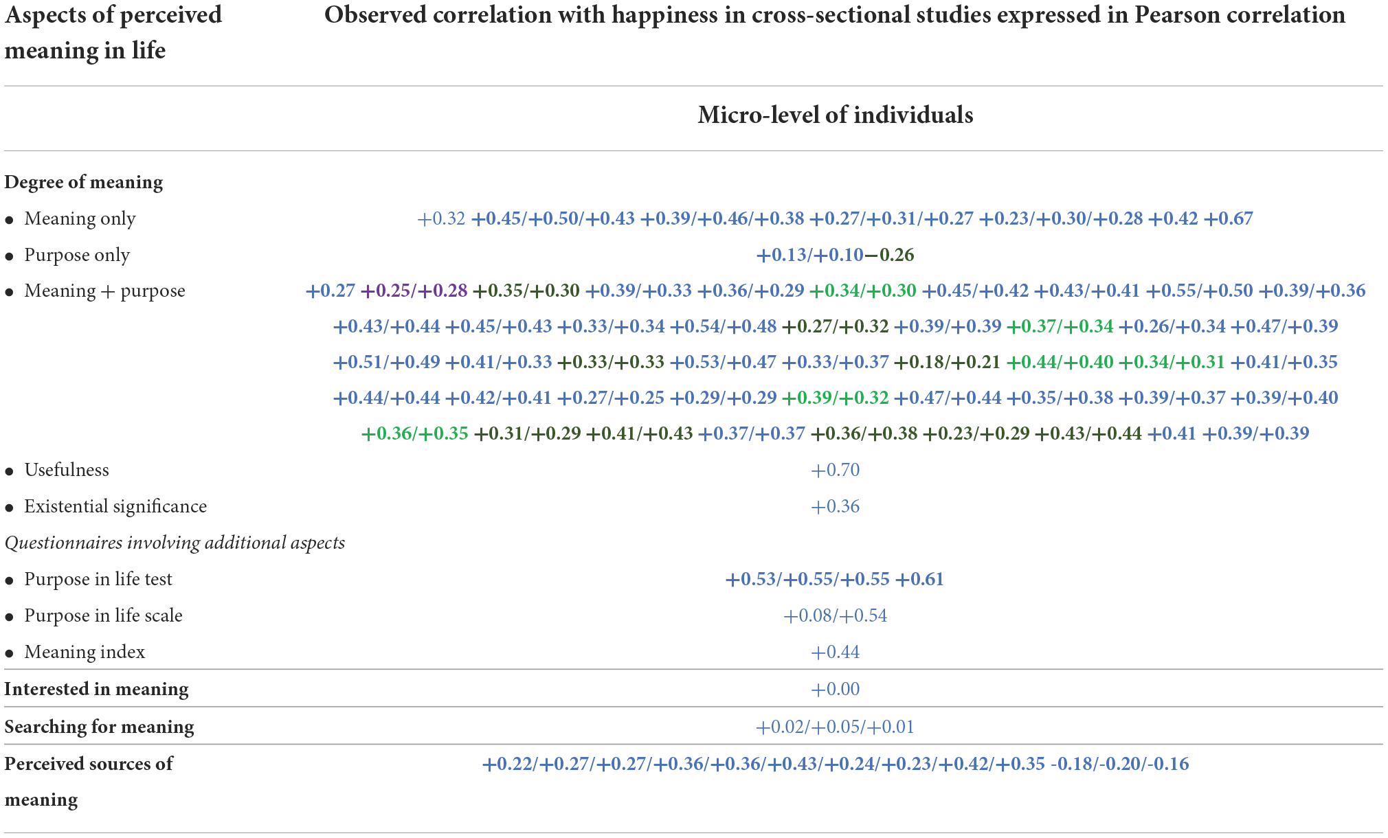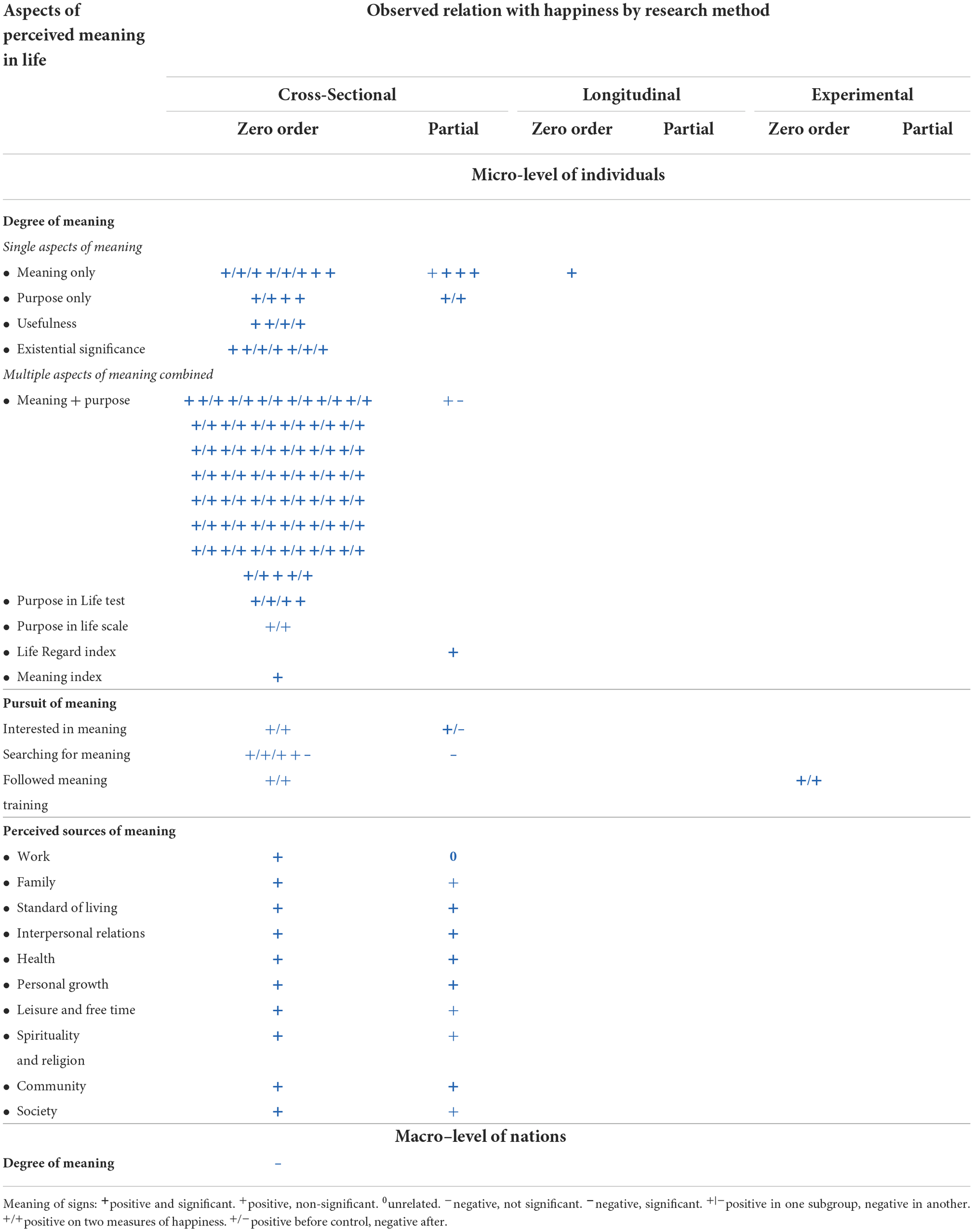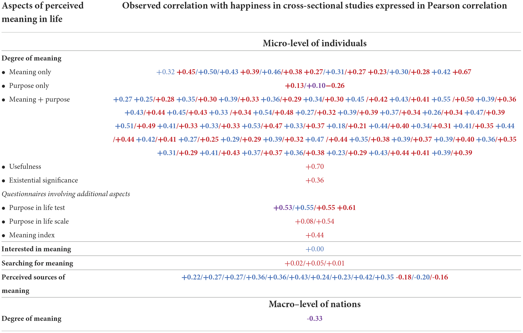 In this study, we started taking stock of facts in section “Results” and next considered what these data tell about some questions about causation in the relation between the meaning of life and happiness in section “Discussion”. As the reader will see, this allows for a complete overview of the available research findings, which can easily be updated. This inductive approach reveals findings that are likely to escape theoretical imagination, such as in this case, that the correlation is positive at the micro-level of individuals but negative at the macro-level of nations.