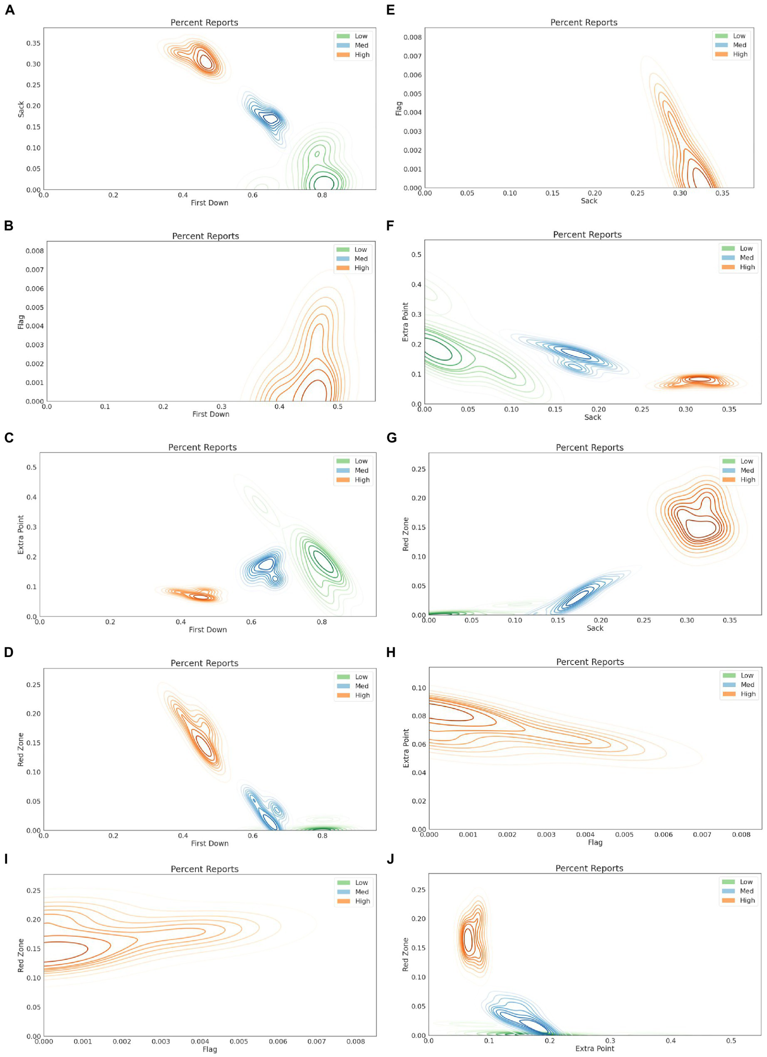 Figure 2. Sample clustering visualizations for a single classroom, showing distributions of percent reports for first down vs. sacks (A), first down vs. flags (B), first down vs. extra points (C), first down vs. red zones (D), sacks vs. flags (E), sack vs. extra points (F), sacks vs. red zones (G), flags vs. extra points (H), flags vs. flags (I), and extra points vs. red zones (J).