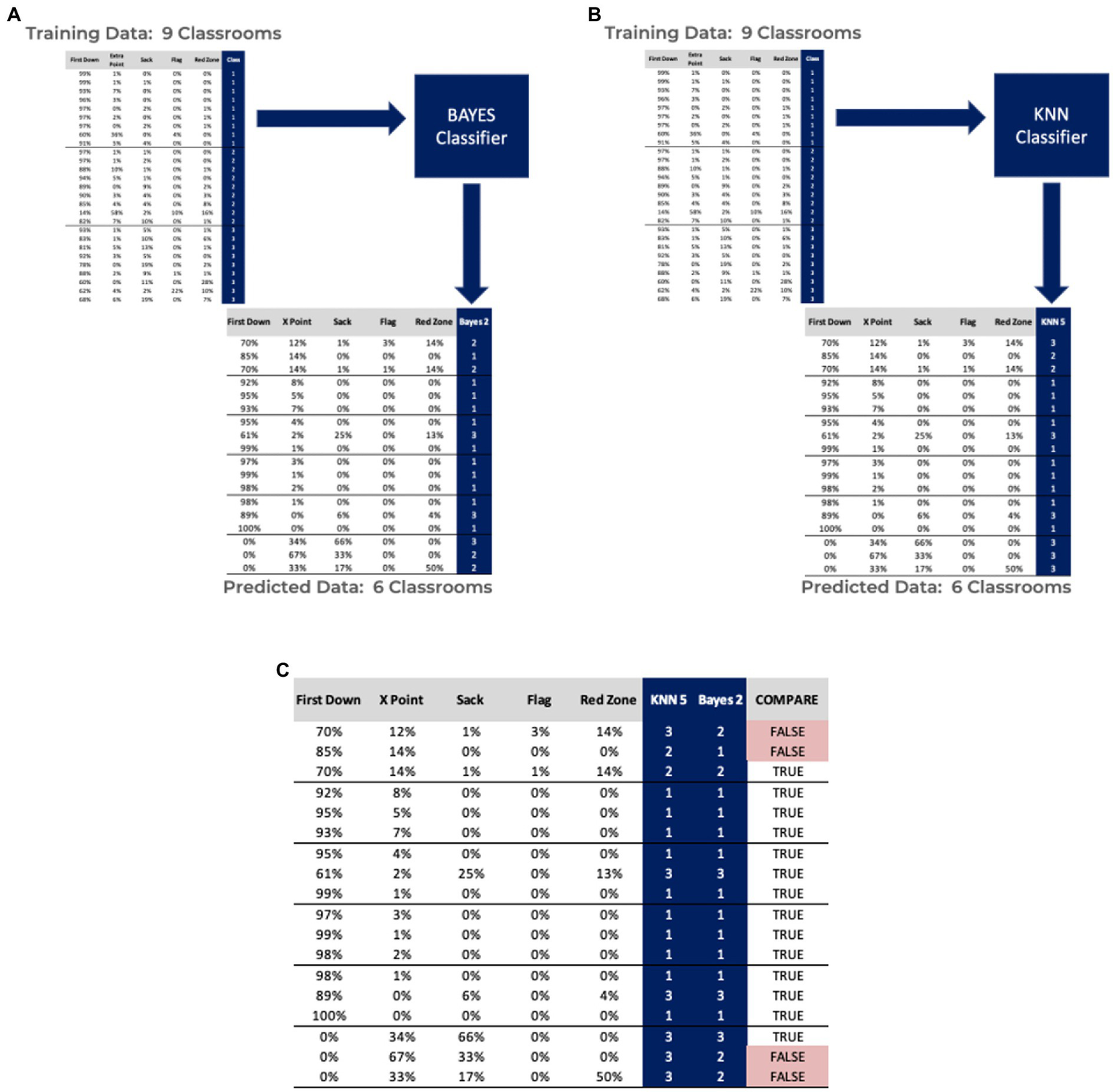 Figure 4, as well as Tables 2, 3 summarize the results from the classification phase of the proposed methodology. The confusion matrices for Bayes and KNN classification steps demonstrate accuracies of 77.8 and 63.0%, respectively. After a second round of qualitative analysis is performed, accepting all labels where the two classifiers agreed, a total of four entries are rejected as outliers and discarded. Further analysis of this classroom data reveals inconsistent reporting behavior from the educators. For instance, as observed in Figure 4C, one classroom did not report any first downs and simply used the Building Dreams platform for recognizing two of the five categories. After completion of the second round of data classification, it is apparent that some classrooms simply do not have three classifications of students, which is the primary disadvantage of the first step where the K-means algorithm attempts to create three distinct groups. We believe we have overcome this drawback by only accepting the clustering results that were observed to be obvious and then training classifiers to attempt to label the remaining data.
