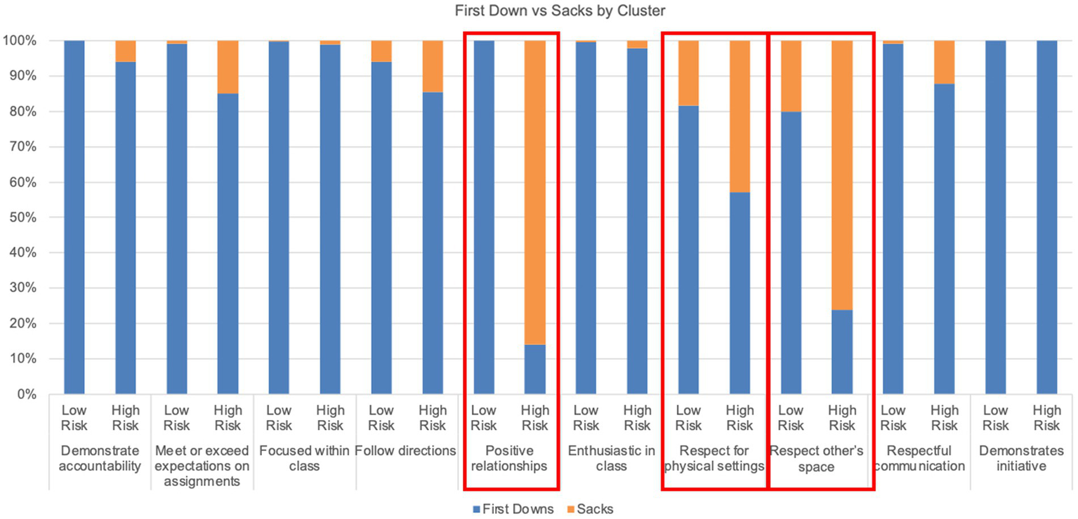 Figure 2 provides a visualization of the clustering results for a single classroom, illustrating the most critical features that differentiate the clusters, while Figure 3 summarizes the cluster centers for nine of the 15 classrooms. For the example shown, first downs, sacks, and red zones, appear to be strong differentiators of the clusters. This pattern is also observed in Figure 3, where is defined by values first downs and lower percent reports of sacks and red zones. Conversely, , is characterized by the lowest percent reports of first downs and highest occurrences of sacks and red zones. Visualizations for all classrooms were generated and evaluated to associate each classroom-level cluster with the most appropriate label, . Clustering was performed on all classrooms, resulting in 45 datapoints from the three clusters for each of the 15 classrooms; however, nine of the 15 classrooms naturally fit into highly differentiated clusters. The highlighted features in Figure 3 were used to determine that clusters 1–3, exemplify low-risk, medium-risk, and high-risk students, respectively. We have found, and presented visually, a clear separation between low- and high-risk clusters.