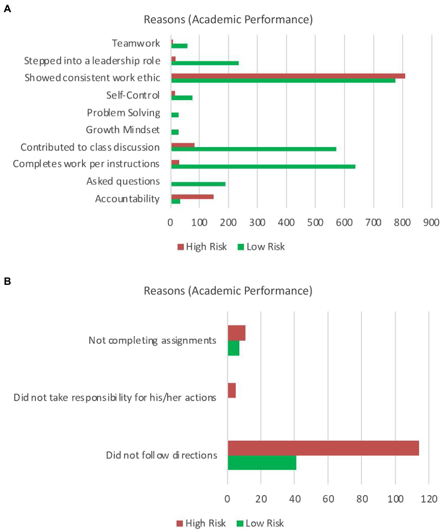 Academic performance was observed to be another key differentiator of high- and low-risk students. When analyzing reasons reported by the teachers, we noticed that there was a clear disparity in reasons directly tied to academic performance. These reasons are summarized in Figure 7, where one subset of reasons could be recognized in either a positive or negative perspective, while another subset of reasons could only be interpreted as a negative report, in Figures 7A,B, respectively. The examples in Figure 7A illustrate how the low-risk group was reported for the same reasons as the high-risk group, but in a positive context instead of a negative one, while Figure 7B provides example reasons that were only cited in a negative context and show a large discrepancy between opposing risk groups. The low-risk student groups were cited for having strong work ethics, contributing to class discussion, and completed course work per the instructions, while only being cited for not following directions 60% less than the high-risk groups. Conversely, the high-risk students were found to be cited for showing consistent work ethic, but in a negative perspective, as often as low-risk students are recognized in a positive way for the same reason. Both charts illustrate that the high-risk students are responsible for many of the reports related to accountability but were always negatively observed.