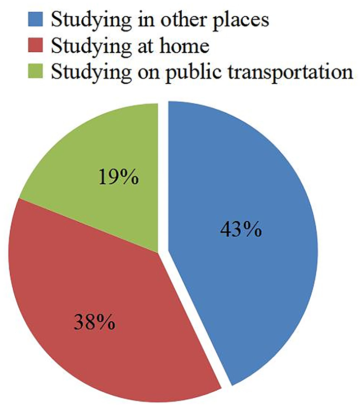 In today's world, with the rapid development of science and technology, all kinds of smart devices flood people's lives. Being easily connected to the Internet, mobile devices such as laptops, smart phones, and tablets, which have small sizes and are really convenient to take are widely used by people. Especially, the popularization of smart phones makes the devices have become an indispensable part of our daily life. Until the year 2021, with the improvement of the functions of mobiles and the decrease in their price, there are over 70% of people all over the world use smart phones and 90% of the population use mobile broadband networks. The popularity of mobile devices has made various application software programs. Currently, mobile terminals, including mobile phones and tablets, enable mobile applications to be used in every field such as medical treatment, commerce, and education (Gayatri and Subrahmanyam, 2021; Khrais and Alghamdi, 2021; Kirsi et al., 2021; Seo et al., 2021; Wang and Qi, 2021). People can use applications with their mobile devices everywhere, which can bring tremendous changes in the informatization of society. In terms of mobile applications, educational applications have the most development prospects and market potential. College students have a strong receptive ability to new things, so the use of electronic devices for learning has become very common for them. According to a survey of 500 learners who have smart phones or tablets, it is found that 96% of them had non-classroom learning experiences, among them, 38% studied at home, 19% studied on public transportation, and 43% studied in other places (Figure 1). The results suggest that learners use mobile applications on a large scale to learn anytime and anywhere, and the applications make a fundamental change in their way to learn. When mobile application appears in classroom teaching, it expands the learning space and personalizes learning services for learner; when designing the courses for college students with mobile applications as teaching methods and means, it has not only changed the traditional learning method, which fundamentally changed the learning environment and conditions, but also changed the original passive state of learners and turned them into the master of learning behaviors (Liu et al., 2015). In the background of advancing the deep integration of information technology and education, mobile applications are regarded as a means of information technology. In addition, because smart terminals such as smart phones are easier to introduce into the teaching process, various mobile learning platforms have emerged. SDT emphasizes the interaction between the external environment and individual learning. If the two are harmonious and unified, it will play a promoting role, otherwise, it will form a block. These mobile learning platforms are the carriers of knowledge and emotional interaction between teachers and students and play an important intermediary role. The use of these platforms has great significance to promote the realization of learner-centered classroom teaching and is also conducive to the cultivation of innovation and high-quality applied talents in local colleges under the conditions of informationization. Therefore, the construction of a convenient, flexible, and efficient mobile learning platform can gradually promote students' motivation and internalization of learning. The autonomous mobile learning methods based on mobile terminals such as smart phones as the carrier are gradually being applied in the education field, which can create excellent conditions for everyone to realize lifelong learning, and will also become the main development direction of knowledge learning in the future (Brown, 2005; Walsh, 2015).