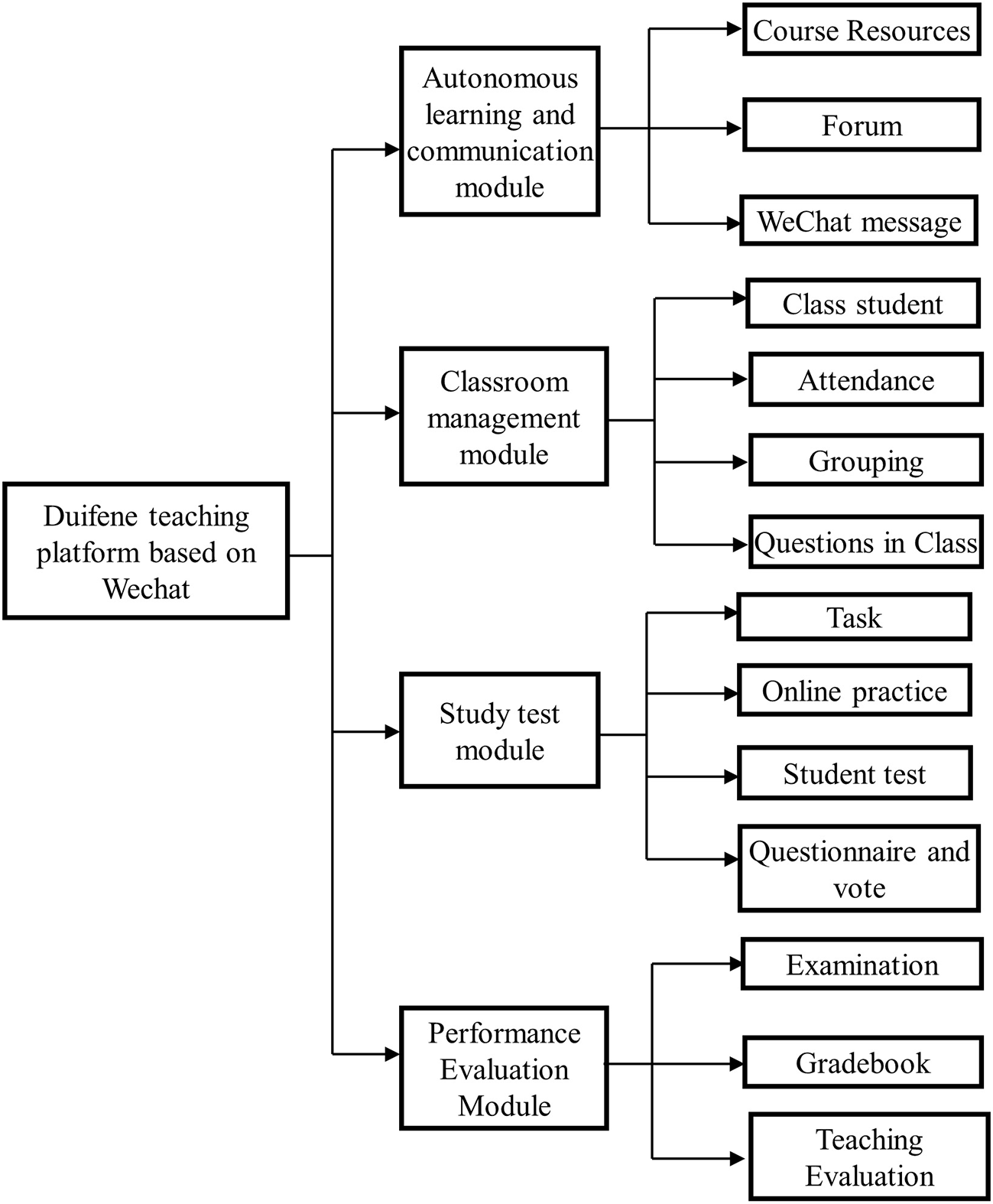 The Duifene teaching platform based on WeChat official accounts provides teachers and students with many functions including class student management, homework, attendance statistics, grouping, course resources, online exercise, discussion areas, classroom questions, questionnaires, voting activities, transcripts, WeChat messages, and teaching evaluation. It supports teachers and students to simultaneously use all the functions and services of the Duifenyi platform on computers and mobile phones. The structure of teaching function provided by Duifenyi is shown in Figure 3, we can select corresponding function modules according to course content, knowledge structure, and teaching design of the Flipped Classroom.