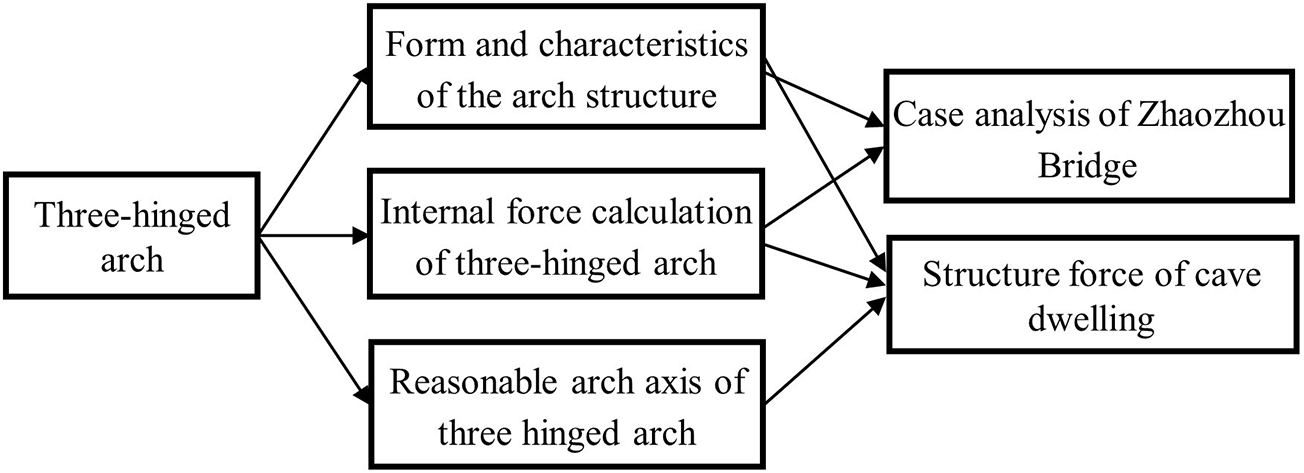 The relationship diagram between the three-hinged arch knowledge module, knowledge points and case projects.
