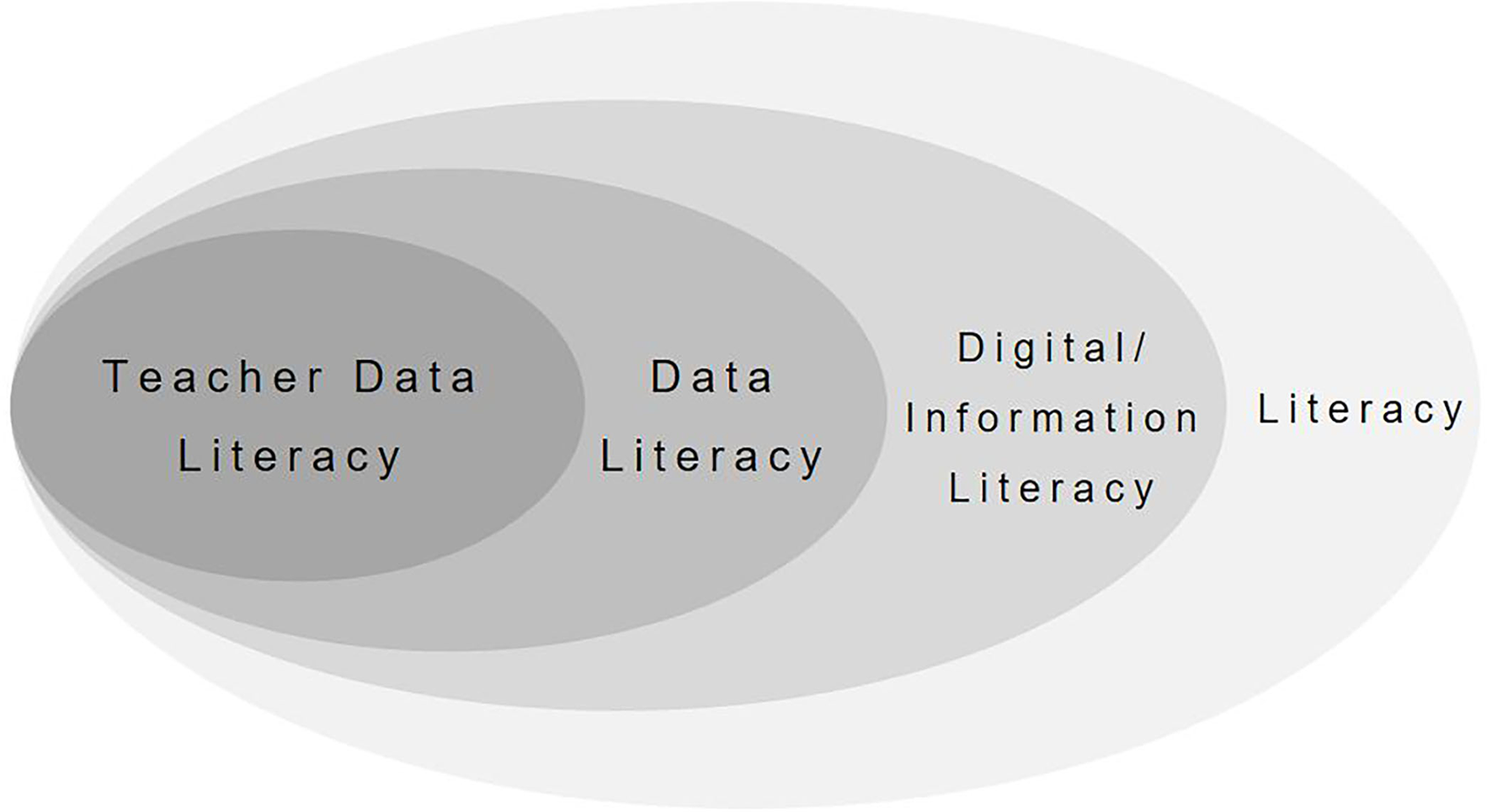 Data literacy refers to “a set of abilities relating to the use of data” (Maycotte, 2014; Wolff et al., 2016), and teacher data literacy (TDL) is only one small form of it (see Figure 1). According to the Data Quality Campaign (2014), TDL can be defined as the process of continuously, effectively, and ethically accessing, interpreting, processing, and exchanging various types of data from state, local, classroom, and other sources to improve students' performance in a manner appropriate to the professional roles and responsibilities of educators. In an alternative definition, (Mandinach et al., 2015a) described TDL as an ability to collect, analyze, and interpret all kinds of educational data to help determine instructional measures. Overall, while no unified and comprehensive definition of teacher data literacy in the field of education currently exists, it is widely understood to combine an understanding of data, discipline, practice, pedagogy, and students (Mandinach et al., 2015a) to improve pedagogical decision-making (Ndukwe and Daniel, 2020). The assumption is that better data literacy will improve teachers' ability to instruct their students and will ultimately raise student performance levels (Mandinach and Gummer, 2016a). Moreover, a data-driven decision-making process will provide teachers with more accurate measures of pedagogy, assessment, and classroom management, and accelerate their professional development (Kennedy-Clark and Reimann, 2021). Recent studies have also stressed the need for teachers to develop their practical and communicative skills by sharing timely and targeted feedback data instantly with students (Cui et al., 2019). Along with teachers, school leaders are now advised to base interventions on data wherever possible (Kippers et al., 2018; Mandinach and Schildkamp, 2021), reflecting its power to transform education at all levels and in all aspects (Mandinach et al., 2015b; Wolff et al., 2016).