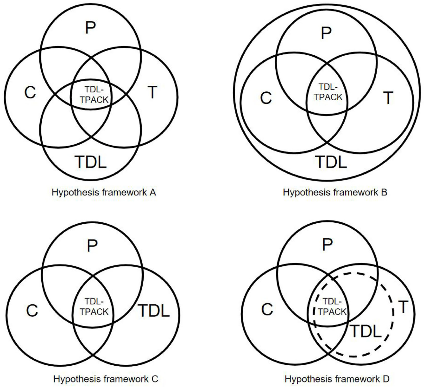 Different types of hypothesis frameworks of TDL-TPACK based on ORID. Hypothesis framework A—TDL is considered as a separate domain of teacher knowledge. In other words, the TDL is seen as an independent component, and is connected with the original three components of TPACK. In this perspective, proponents argue that teachers should think about and take instructional design in the context of a complex interaction of four components and the fusion of these four components constitutes the core knowledge field of teachers. Hypothesis framework B—TDL is considered as a contextual component of the original three components of TPACK, and it offers a fundament and background for the integration of TDL-TPACK. Proponents of this view believe that teachers should integrate pedagogy, technology, and content in a way that takes full account of teacher data literacy. Hypothesis framework C—TDL replaces the original technology knowledge (TK) and integrates it with pedagogy knowledge (PK) and content knowledge (CK), resulting in a core knowledge field of teachers. The proponents of this idea argue that the changing of technology leads to the creation of data literacy, and therefore teacher data literacy should replace basic knowledge of technology for the development of the smart education era. Hypothesis framework D—TDL is seen as an important component of TK, and it integrates with PK and CK, resulting in an core knowledge field of teachers. Proponents of this framework emphasize that the role and breadth of technology is broader than TDL. Whereas TDL builds on traditional technology, it is as an intrinsic dimension of TK that TDL can only be integrated with other elements of the TPACK.