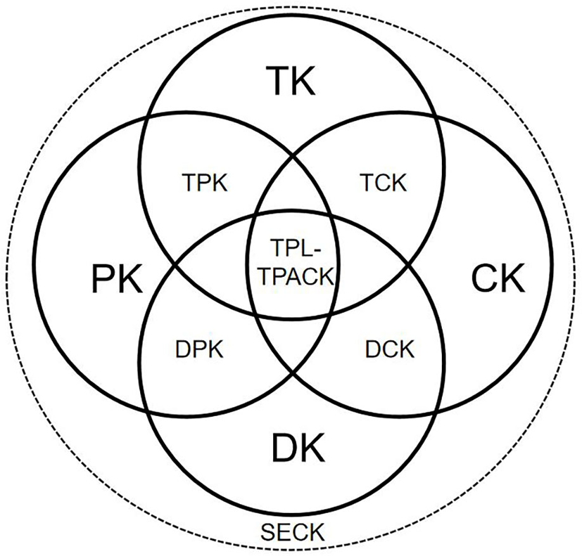 Technological Pedagogical Content Knowledge (TPACK; Koehler and Mishra, 2006) is a widely used theory building on the earlier notion of pedagogical content knowledge (PCK). It identifies the three basic elements of teachers' knowledge as technology (T), subject content (C), and teaching pedagogy (Phillips and Harris, 2018). The complex interactions between these elements form four composite knowledge domains: PCK, TCK, TPK, and TPACK (Valtonen et al., 2017; Ifinedo et al., 2020). A change in any element of TPACK will cause alterations in the other elements, and improvements in any single element can help to develop teachers' knowledge (Chong, 2021). TPACK provides a fruitful way to resolve the many dilemmas teachers face when implementing educational technology in the classroom. It indicates that teachers must operate in the complex space of technology, content, and pedagogy, and integrate technology with traditional knowledge whenever possible (Cui and Zhang, 2021). By distinguishing between these three types of knowledge, TPACK can guide teachers to use specific technical tools (hardware, software applications, etc.) to help students better understand topics (Mishra and Koehler, 2006). Furthermore, TPACK raises teacher awareness of the need to integrate their knowledge of content, pedagogy, and technology, and many complex phenomena can be analyzed and explained within the framework (Jiawei and Zuhao, 2021). TPACK is therefore widely regarded as an effective analytic tool for improving teaching.